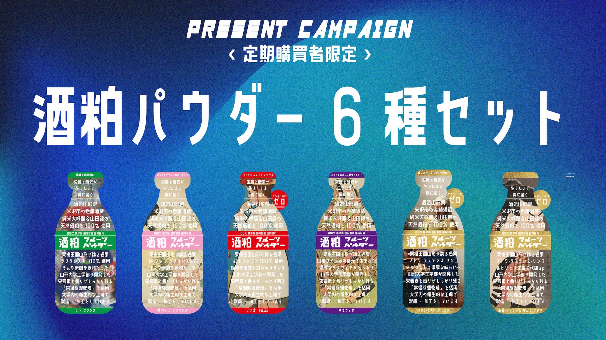 フルーツ酒粕パウダーの定期購入をご利用の方には、いろいろな味が楽しめる「フルーツ酒粕アソートセット(6種)」をプレゼント。豊かな風味の違いをお楽しみいただけます。