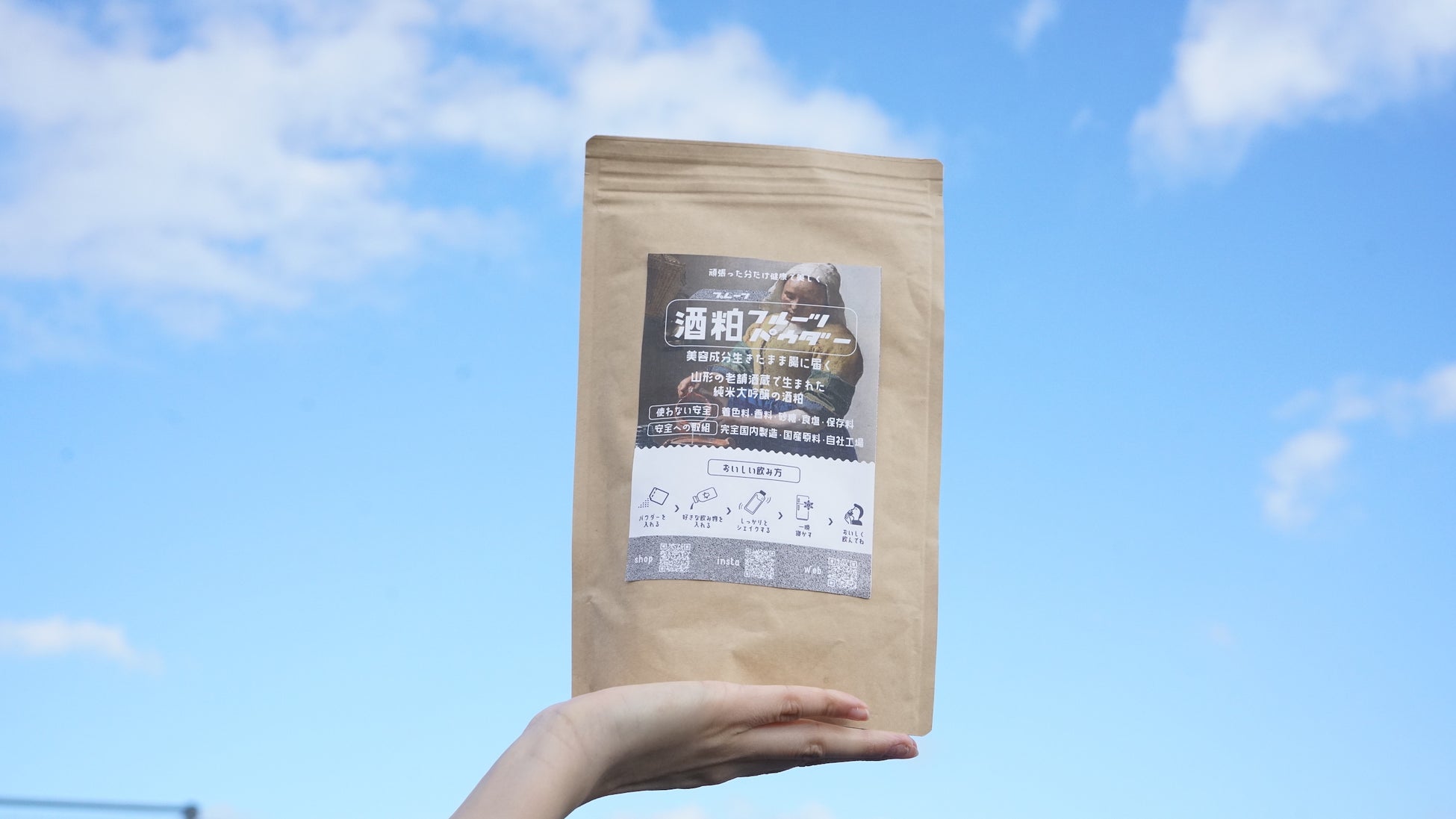 山形の老舗酒蔵で生まれた天然酒粕を使用し、ビタミンB群や食物繊維、アデノシン、オリゴ糖などを豊富に含んだ「フルーツ酒粕パウダー」です。ヨーグルトや豆乳と混ぜると、整腸効果や美肌サポート成分が腸までしっかり届きます。