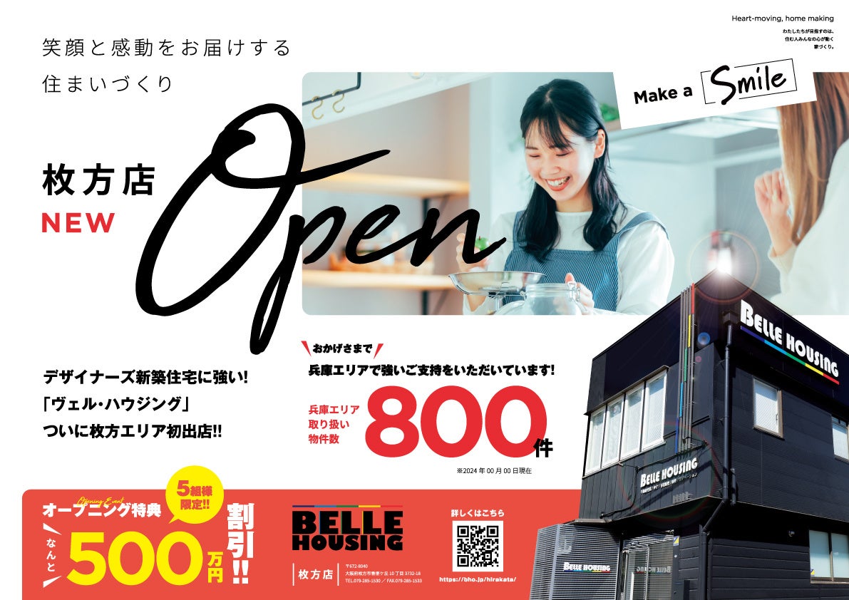 BELLE HOUSINGは、枚方支店のオープンを機に、大阪府北部エリアのお客様により一層寄り添った住まいづくりのサポートを行ってまいります。「Make a Smile」をモットーに、お客様一人ひとりの笑顔あふれる暮らしを実現するため、最適な住まいのご提案と質の高いサービスを提供してまいります。