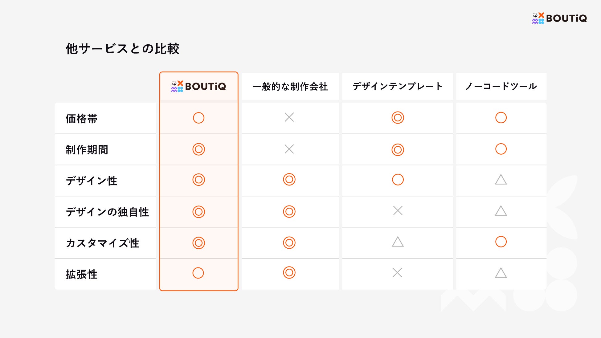 BOUTiQと似たようなサービスとしてテンプレートやノーコードツールなどが挙げられますが、その中でも各項目を総合的に見てみると、BOUTiQが高品質であることが明瞭かと思います。