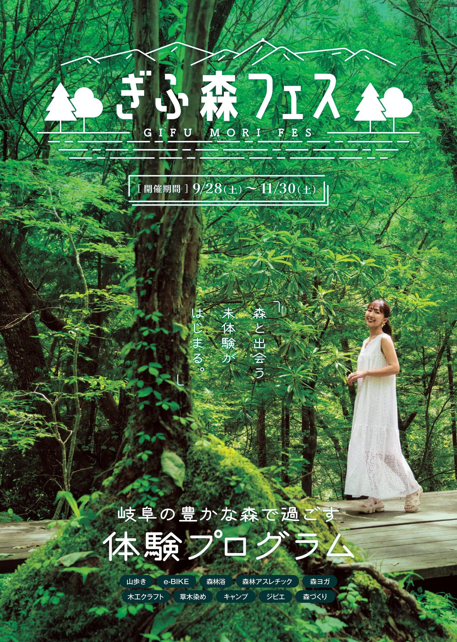 「ぎふ森のある暮らし推進協議会」では、県内各地の森林空間を活用した、森林アスレチック、Eバイク体験、森林浴などの40以上の体験プログラムを楽しめるイベント「ぎふ森フェス」を開催します。