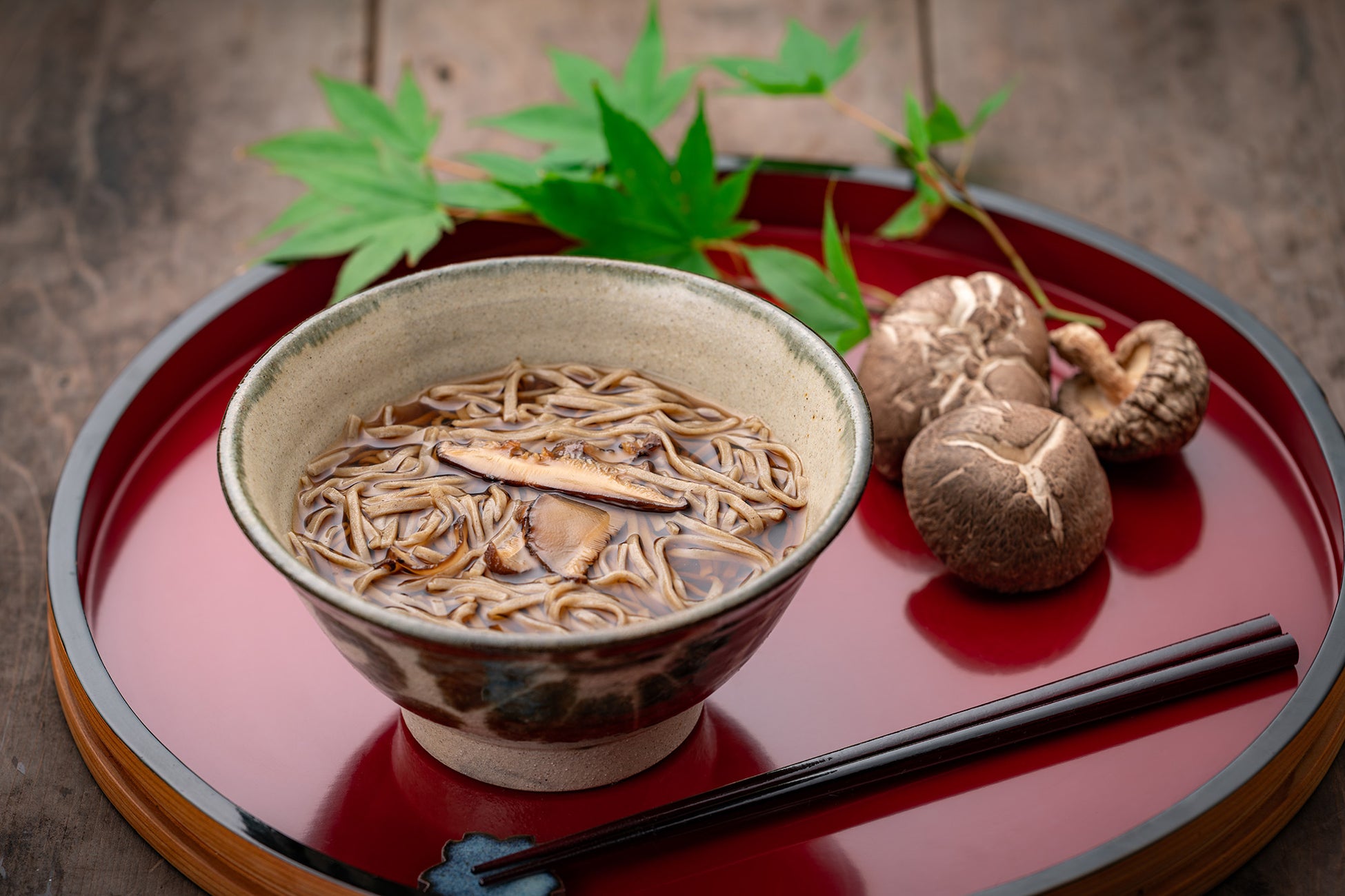 香り豊かで味わい濃厚、これまでのしいたけ出汁のイメージを超える、しいたけ出汁のつゆで、岩城の蕎麦をぜひお召し上がりください。
