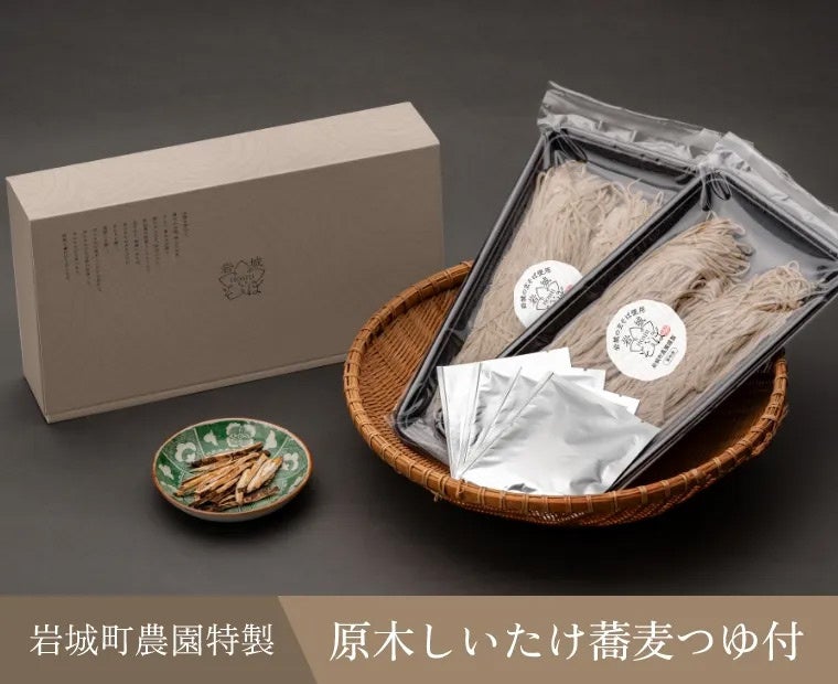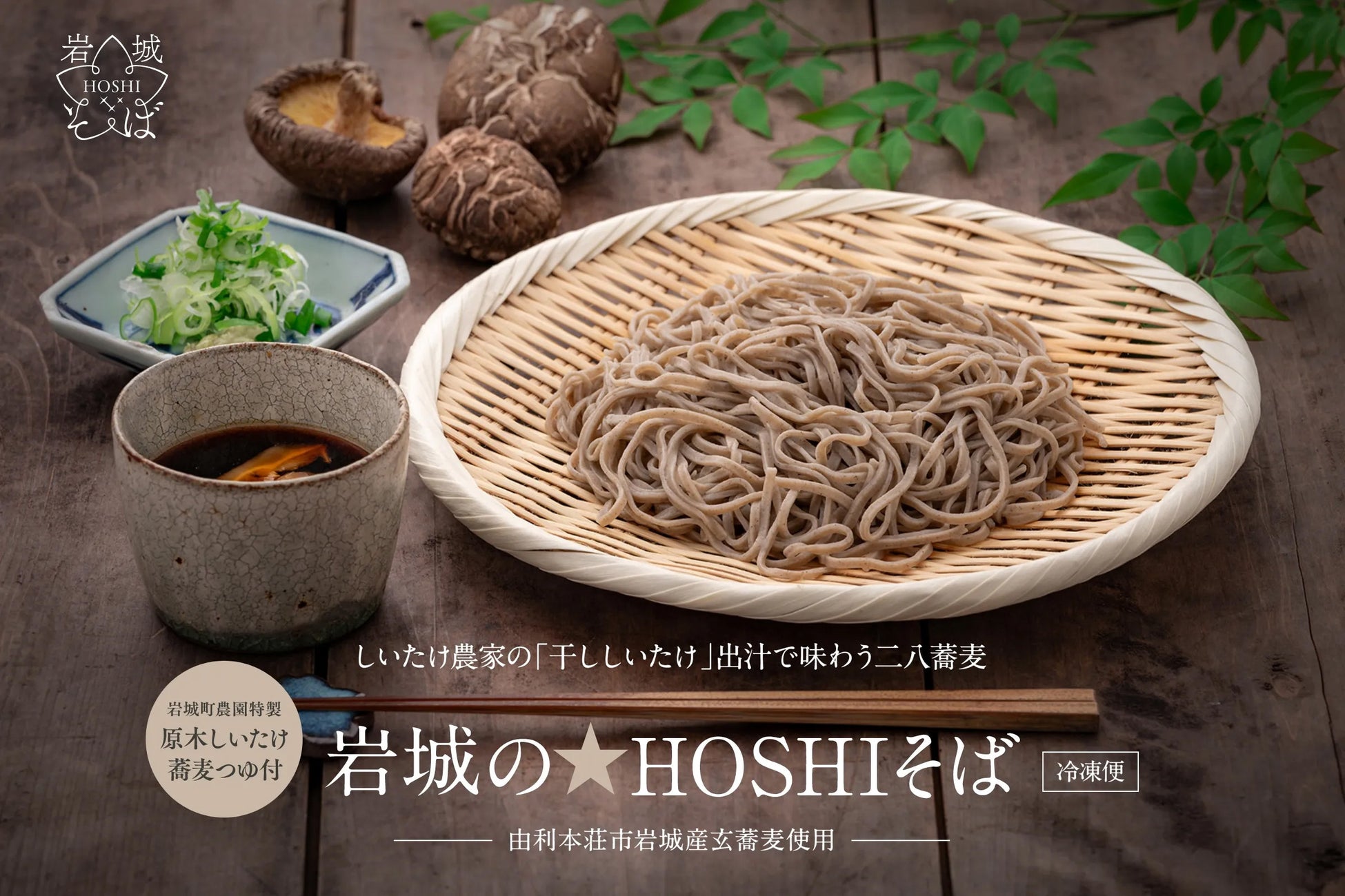 秋田県由利本荘市岩城で50年近くにわたり、原木しいたけの栽培を行ってきた、原木しいたけ農家「岩城町農園」では、高齢化と人口減少、農業従事者の減少対策、そして、長く農業をやってきた、地域の「じっちゃん」「ばっちゃん」の生きがい創出も目的に、岩城で栽培した蕎麦と岩城町農園の自慢の原木しいたけをあわせた、冷凍そば「岩城の★HOSHIそば」開発を行いました。