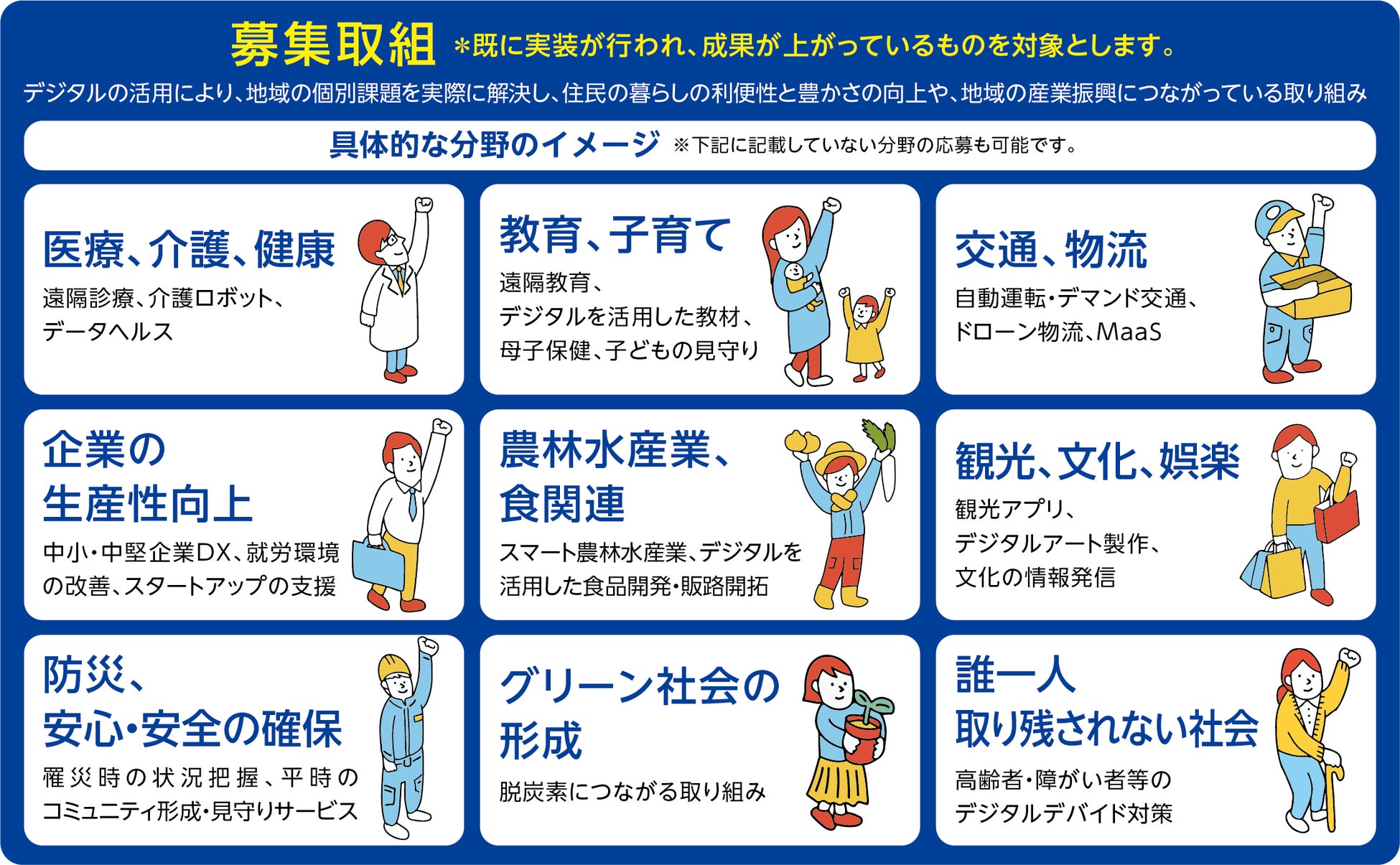 昨年度に引き続き、今年度も、地方公共団体、民間企業・団体など様々な主体がデジタルの力を活用して地域課題の解決等に取り組む事例を幅広く募集し、特に優れたものを内閣総理大臣賞として表彰します。