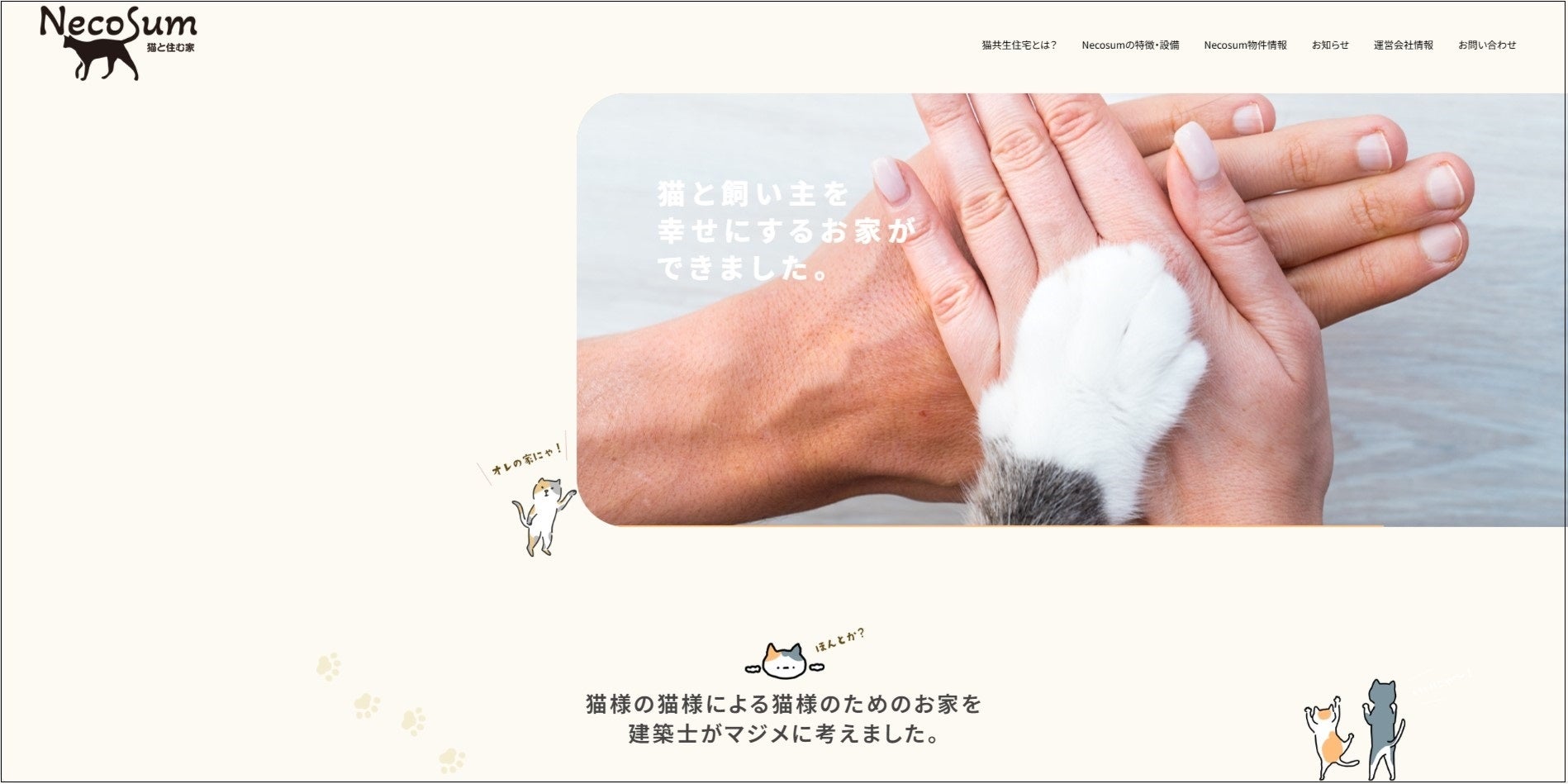 築古の空き家をフルリノベーションし、猫と人が共に快適に暮らすための設備を備えた「Necosum(ねこすむ)」。古い空き家を再生することで、地域社会に貢献しながら、リーズナブルな価格設定で猫共生賃貸住宅を提供しています。新サイトでは、猫と人両方の快適を考えた住宅の内部の写真や具体的な設備情報、そして当社の「Necosum(ねこすむ)」への想いも込めて「Necosum(ねこすむ)」のすべてを詳しくご紹介しています。