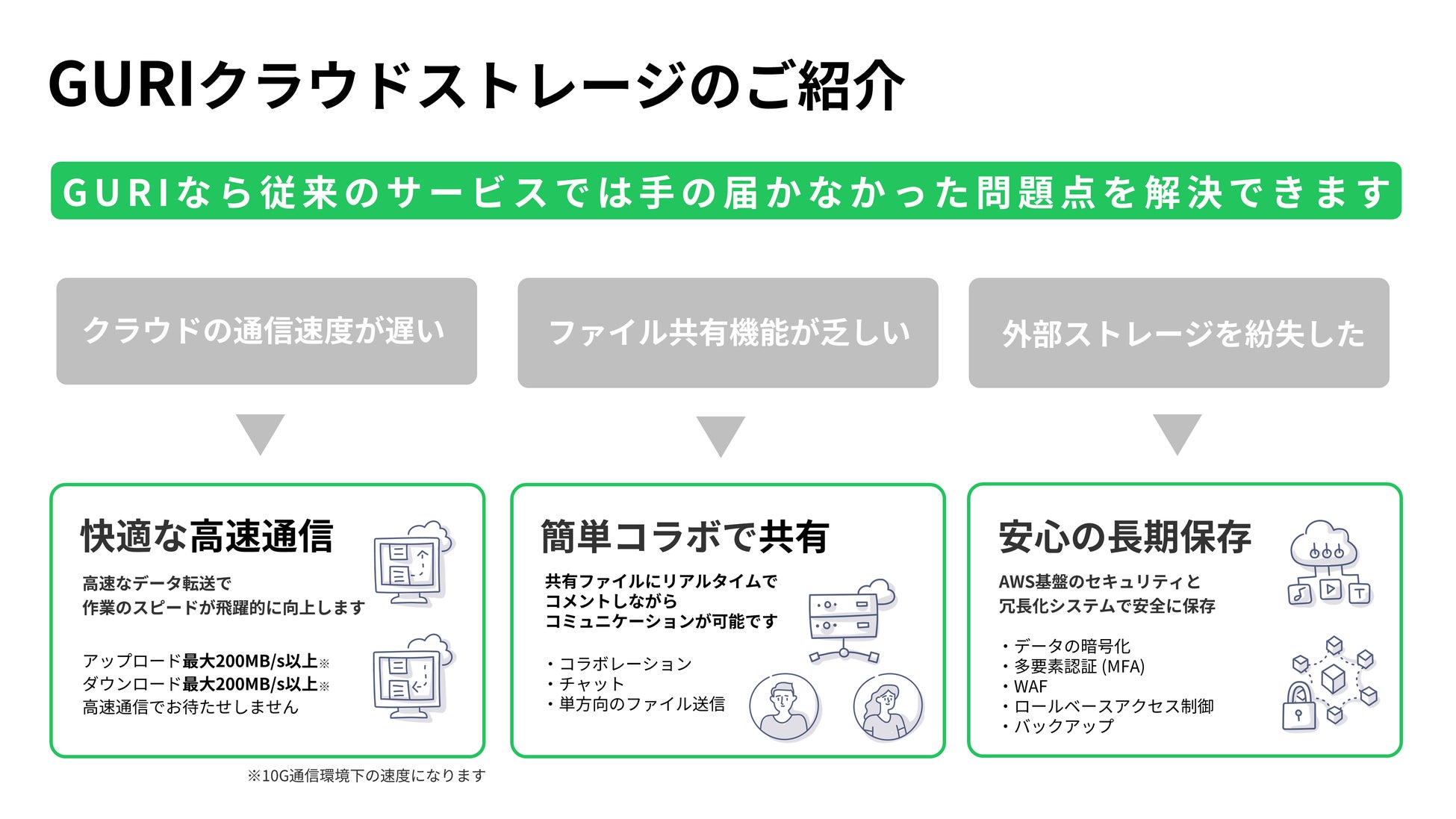 株式会社NODES(本社:神奈川県川崎市、代表取締役 森本 浩二、以下、NODES)は、クラウドストレージサービス「GURI」をリリースいたしました。本プロダクトの企画・開発はNODESが担当し、日本ブイ・テイ・アール株式会社(本社:東京都中央区、代表取締役 室井 俊之 以下、日本VTR)は、映像業界での豊富な知識とノウハウを持つ信頼できるパートナーとして、本サービスの構築を支援しています。「GURI」は大容量データを高速かつ安全に共有し、企業の業務効率化を実現するための最適なソリューションです。