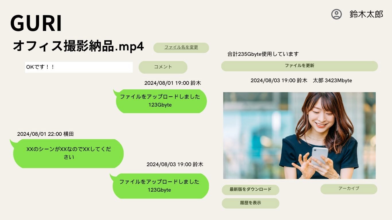 GURIは、シンプルで直感的なユーザーインターフェースを採用し、初心者でも簡単に操作できます。組織内外のメンバーを招待してリアルタイムでコメントを付けながらファイルを共有し、即座にフィードバックを反映できます。これにより、チーム間のコミュニケーションが円滑になり、プロジェクトの進行を加速させます。