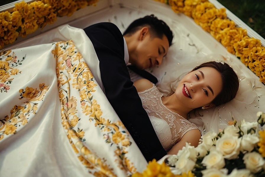 通常の一人用棺に加え、二人で入れる「夫婦棺」も用意しています。カップルや友人同士、また「死がふたりを分かつまで」を体現するウェディングフォトとして