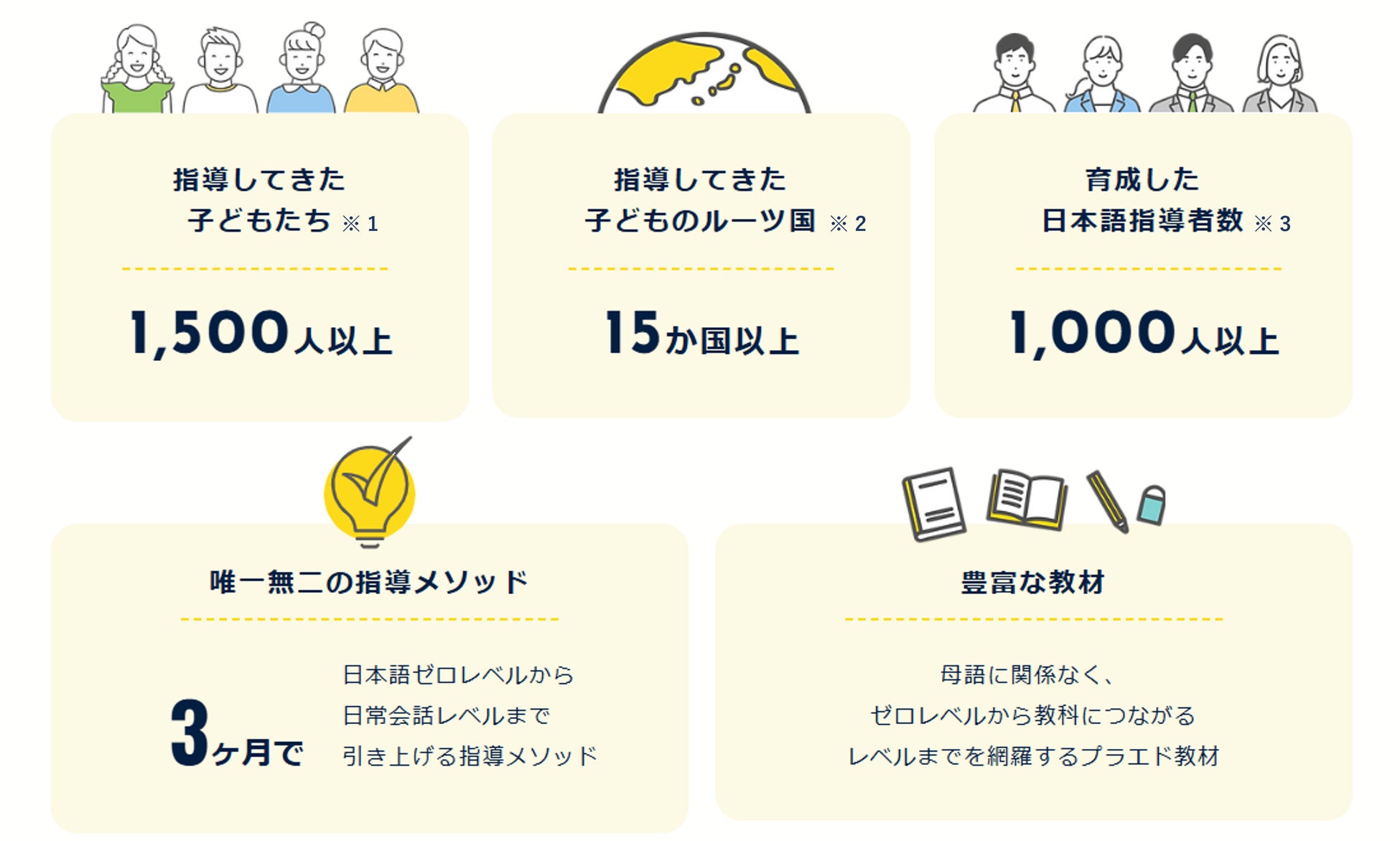 当法人ではこれまで15年間で、6~15歳の子ども約1,500人へ日本語指導を行ってきました。トライ&エラーを繰り返す中で、「3ヶ月で話せる」独自メソッドと、日本語ゼロレベルから使え、日本語を日本語で教えられるオリジナル教材を開発しました。