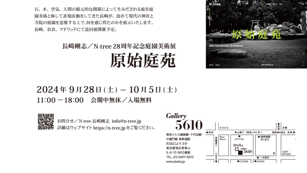このたび、諫早神社の御神苑を手掛けた、N-tree 代表、庭園美術家・長崎剛志の N-tree 28 周年記念庭園美術展『原始庭苑:げんしていえん』が開催されます。