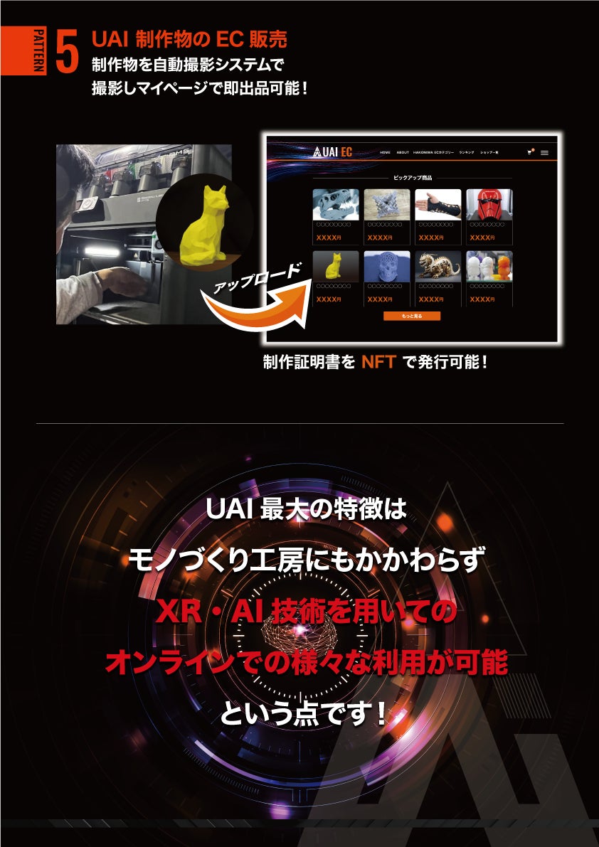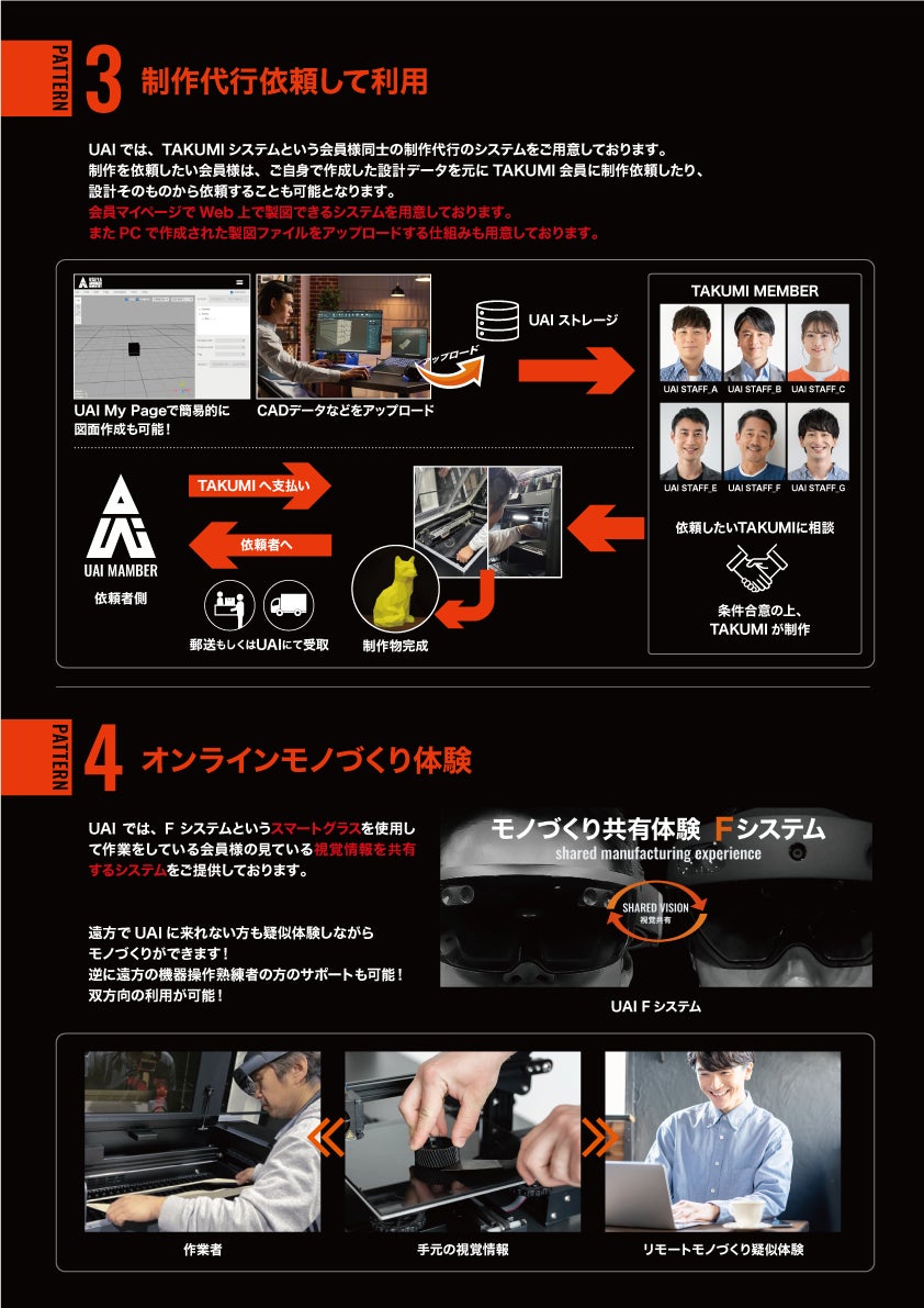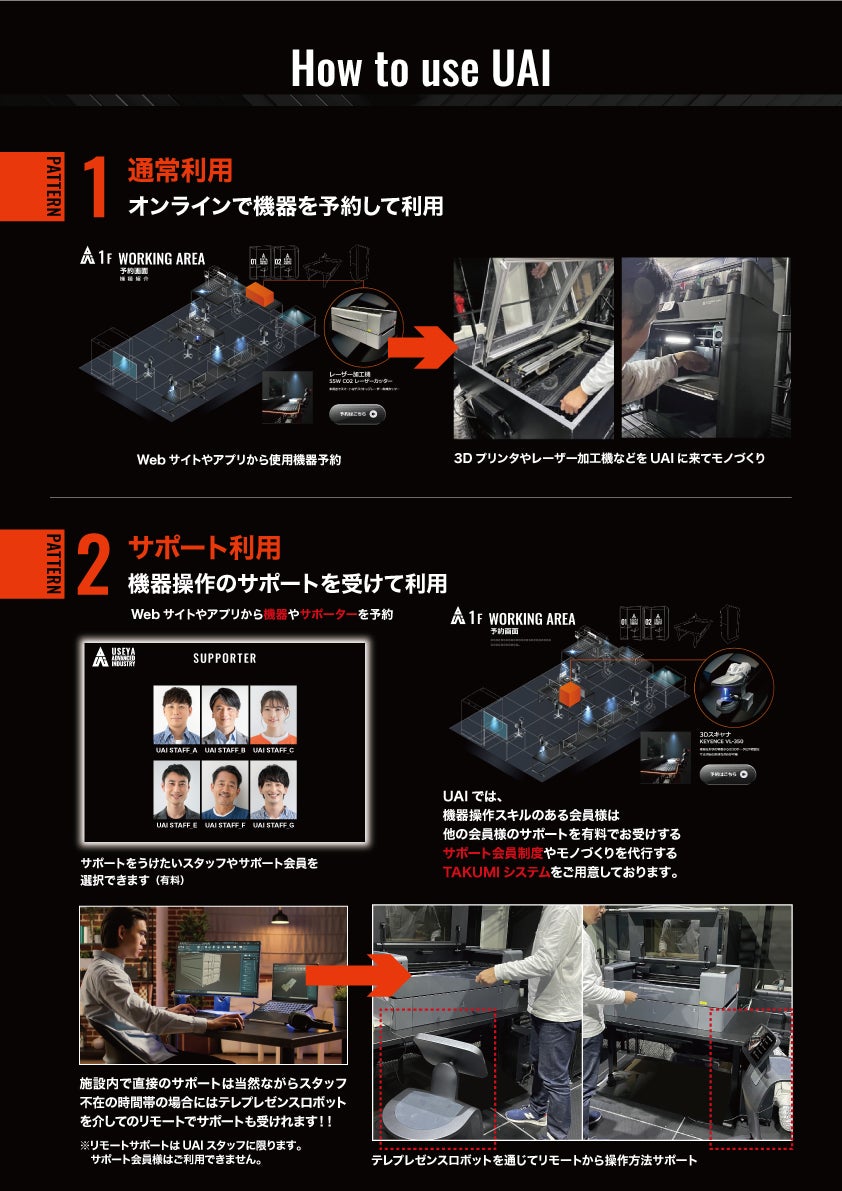 UAIには、スマートグラス(HMD)、3Dスキャナ、3Dプリンタ、UVプリンタ、レーザー加工機、自動撮影システム、個室ブース等が完備されています。またデジタル機器のシェア工房としてだけでなく、スマートグラスとWEBシステムを駆使して、その場にいなくても、リモート・オンラインでデジタル機材の操作やモノづくり共同作業ができるシステム、UAIで制作した商品を自動撮影システム(フォトグラメトリ技術)で撮影した写真を即時・自動でインターネット上にアップロードし、即売できるシステム等の独自の先進的テクノロジーを用いた設備が用意されています。