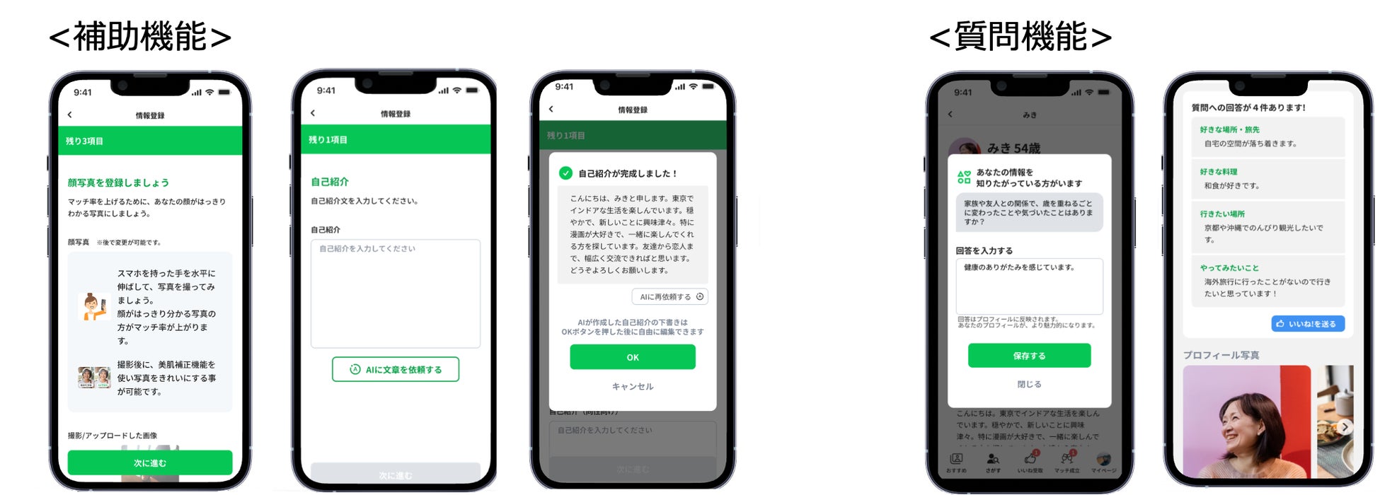 プロフィール写真の設定が不慣れなユーザーに向けて、AIが写真撮影や加工を補助する機能をご用意。自己紹介・自己アピールについても、AIが文章を提案し、さらにメッセージのやりとりまでもサポートします。