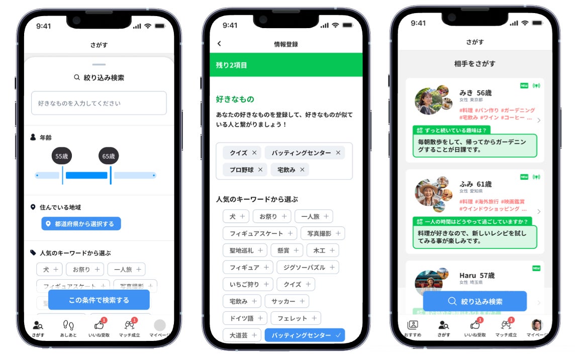 また、自身の情報を登録する際、「骨董品集め」「御朱印集め」「切手収集」「グラブコレクション」など50歳以上の人が関心を持ちやすい趣味を中心に、キーワードを580個以上を用意。共通の趣味を持つ相手を見つけやすく、より一層マッチング率を高めます。