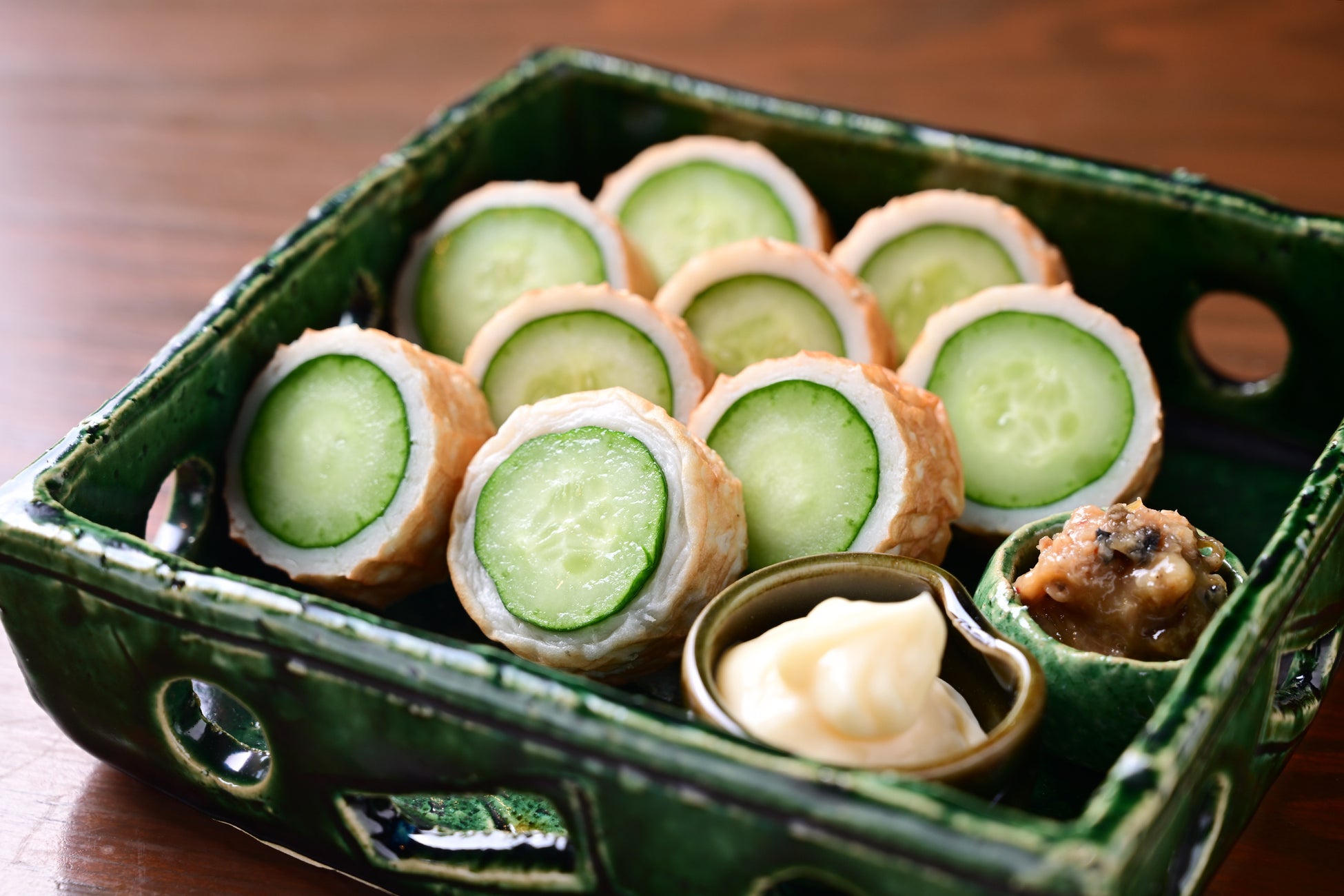 まずは塩で、次に薬味を添えて、更に地元で「酢みかん」として愛される稀少な果実”直七”の果汁をつけて、味の変化をお楽しみください。