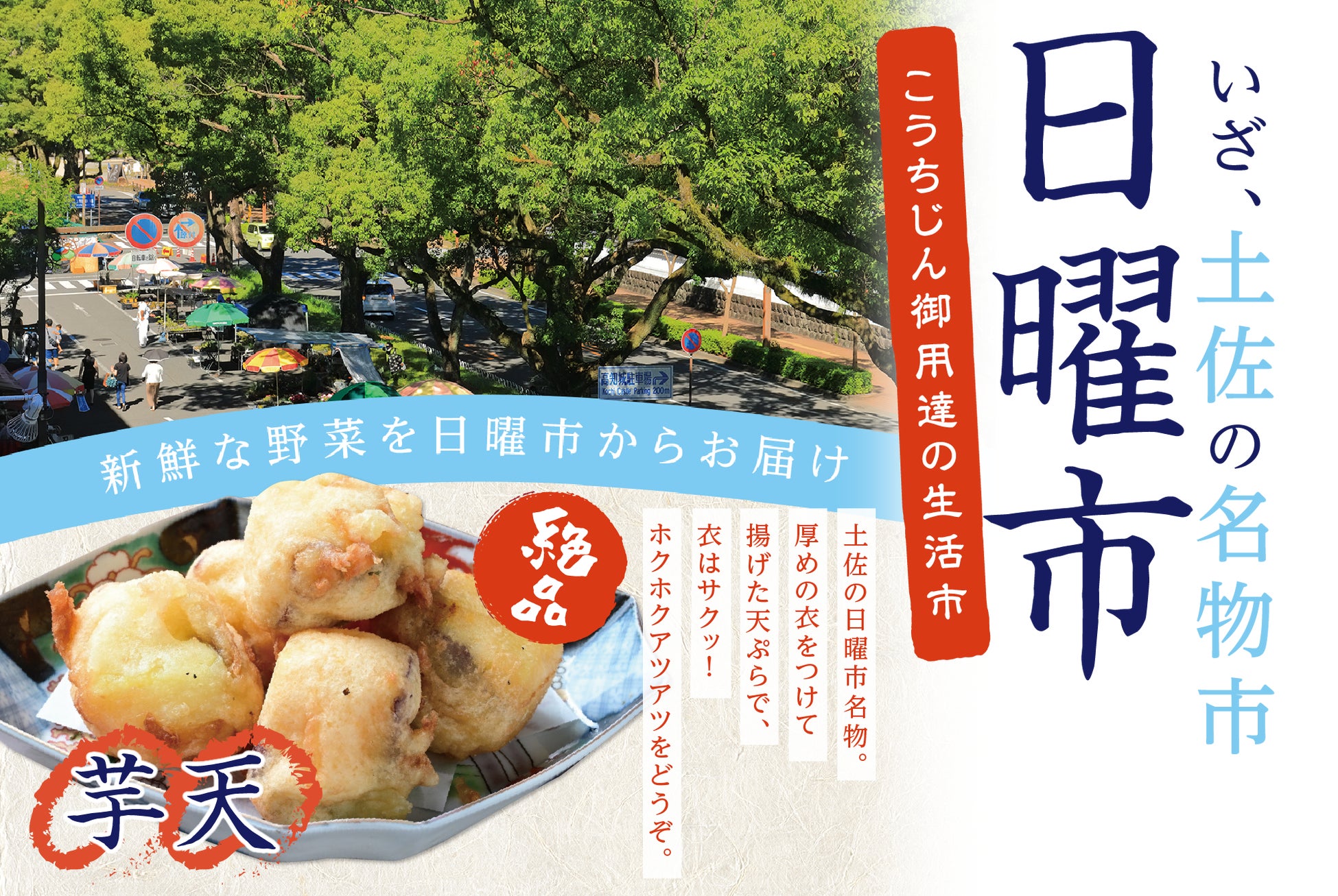 日曜市名物の“芋天”は、厚めの衣をつけて揚げた天ぷらで衣はサクッとしており、ホクホクアツアツです。是非揚げたてをご賞味ください。
