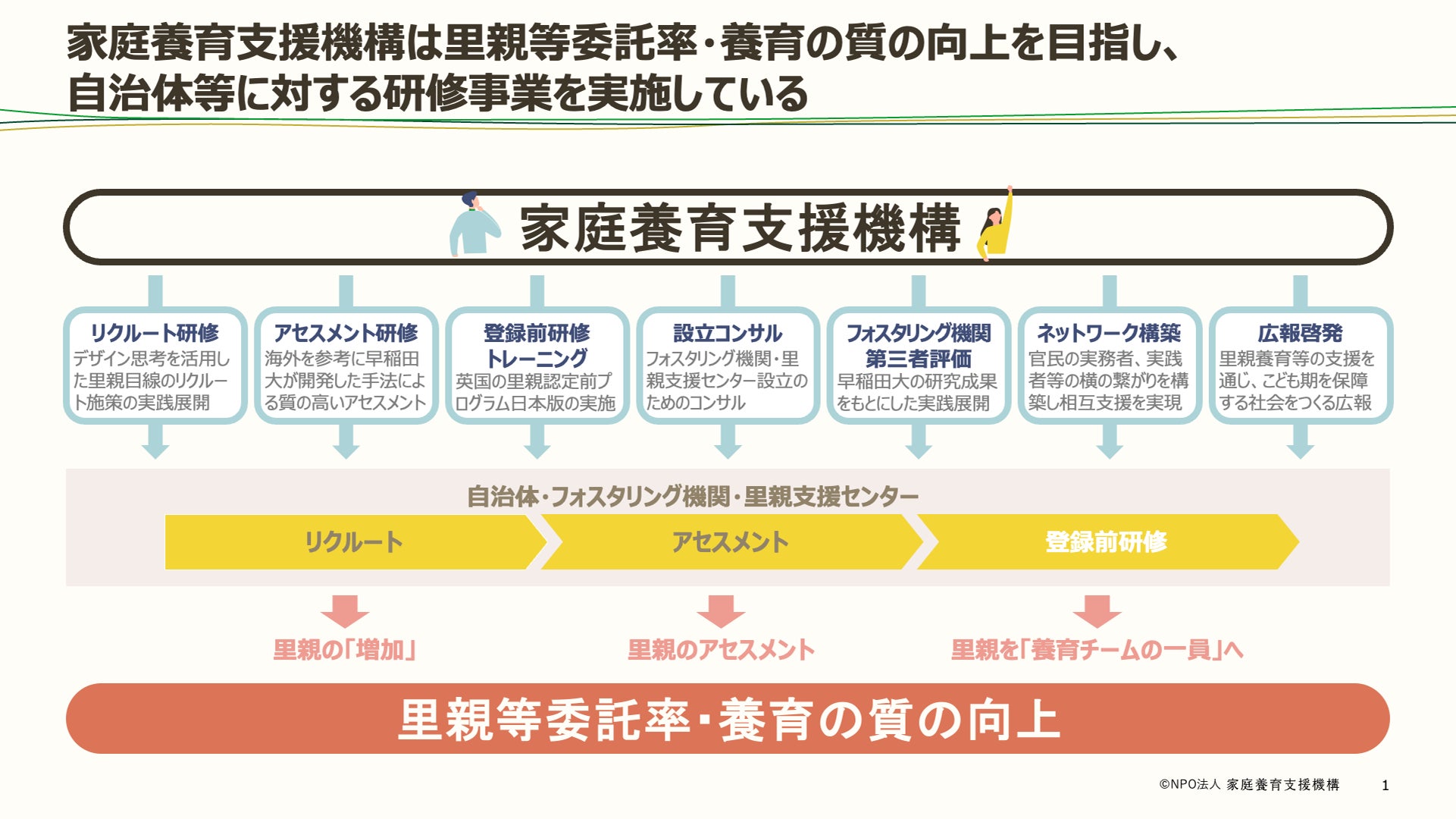私たちは、里親などによる家庭養育の普及啓発、地方自治体や里親支援センターに向けた研修やコンサルティングの提供などを行うことにより、社会全体でこどもが大切なおとなとつながり、育つことへの理解が深まり、里親などに対して質の高い支援が提供されることを目指しています。