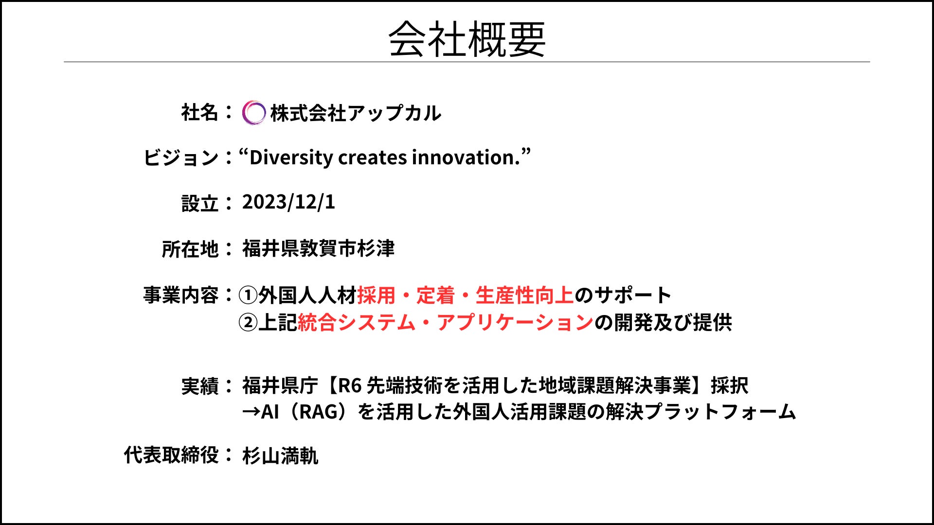 私たちは、株式会社アップカルという【外国人財活用の生産工場・定着・採用の仕組み化に特化】した地域課題解決型のベンチャー企業です。古くから交通の要衝である福井県敦賀市に拠点を置き、北陸・関西・中京を中心に、全国の企業様の外国人財活用に関する課題解決に取り組んでいます。
