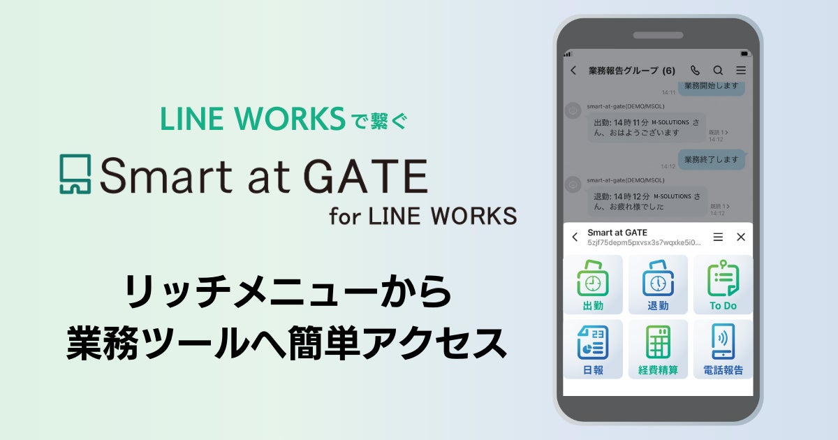 M-SOLUTIONS株式会社(本社:東京都新宿区、代表取締役社長CEO:植草 学、以下 M-SOLUTIONS)は、LINE WORKS株式会社(本社:東京都渋谷区、共同代表:島岡 岳史)と「LINE WORKS認定サービスパートナー契約」を締結し、同社の提供するビジネスチャット「LINE WORKS」のトーク画面下部に、各社オリジナルリッチメニューを設定できるサービス「Smart at GATE for LINE WORKS」(以下:本サービス)を2024年9月30日(月)より提供開始いたします。