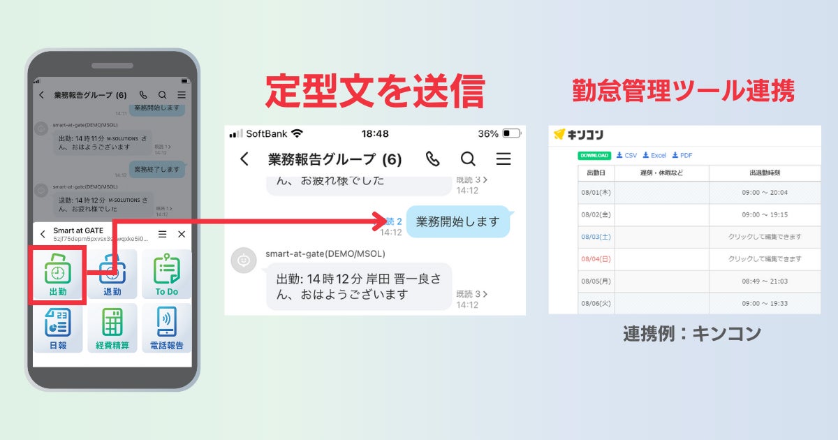 リッチメニューをタップすることで、事前に設定したテキストを送信できます。出退勤管理ツールと連携することで、社内メンバーへ出勤の報告と同時に打刻が完了します。
