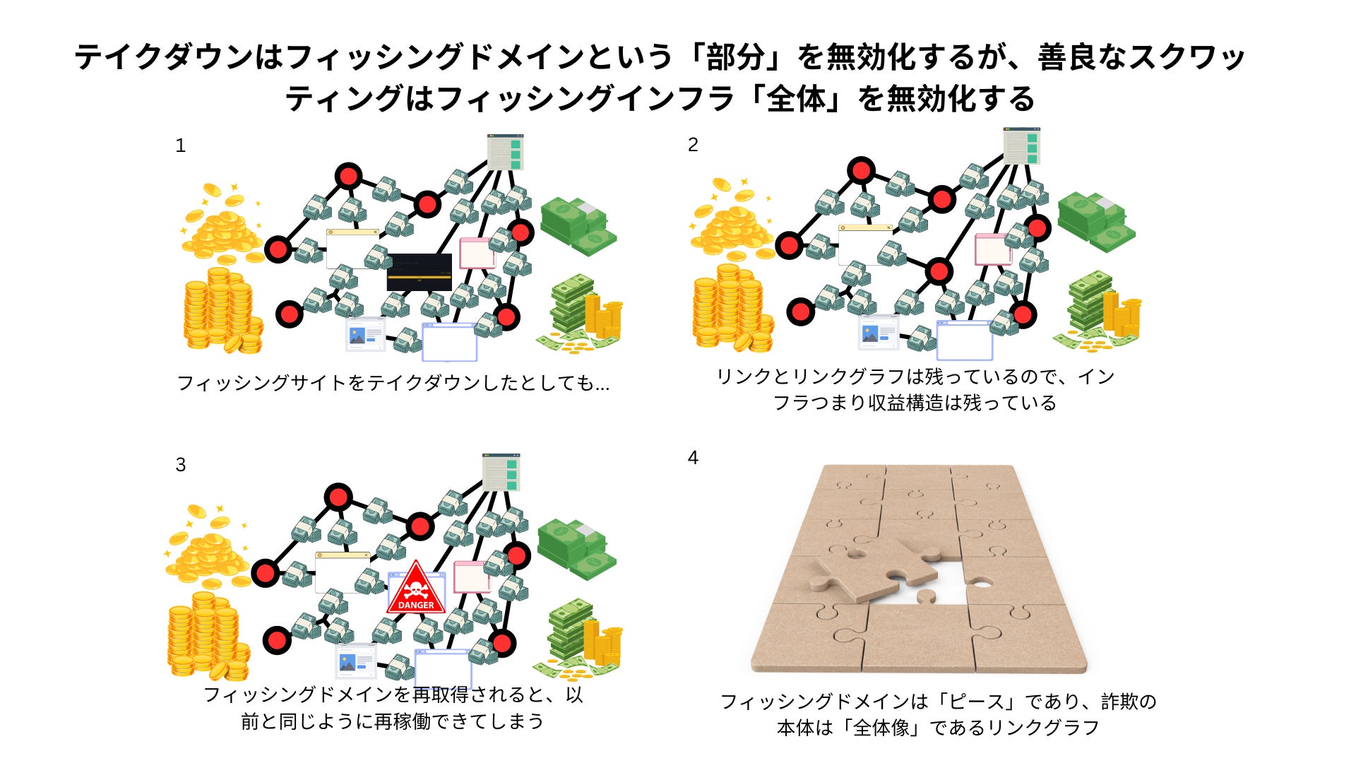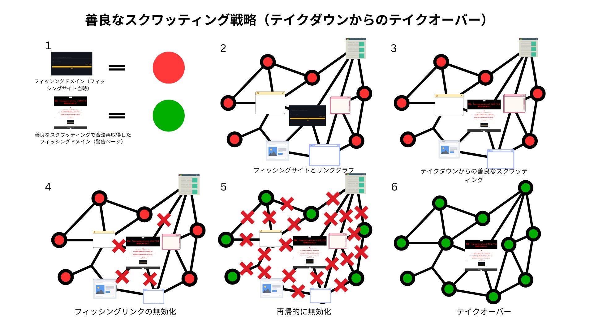 テイクダウン後に当該フィッシングドメインを購入し、警告ページを掲載しつつそこでトラッキングを行うことで、既存リンクの存在意義を無効化する(フィッシング業者の利害に反する活動であり、この場合法執行の延長としての警告ページ掲載を行い、リンクの意味を「反転」させる)ことで、リンクグラフ全体を無効化することに繋がります。つまりテイクダウン後の対策として、フィッシングドメインを取得し警告ページ掲載とトラッキングを行うことが、フィッシング業者が構築したインフラを逆手に取り、エッジの矢印を「反転」させ、それをこちらのものとして使うことを可能にします(テイクダウンからのテイクオーバー)。