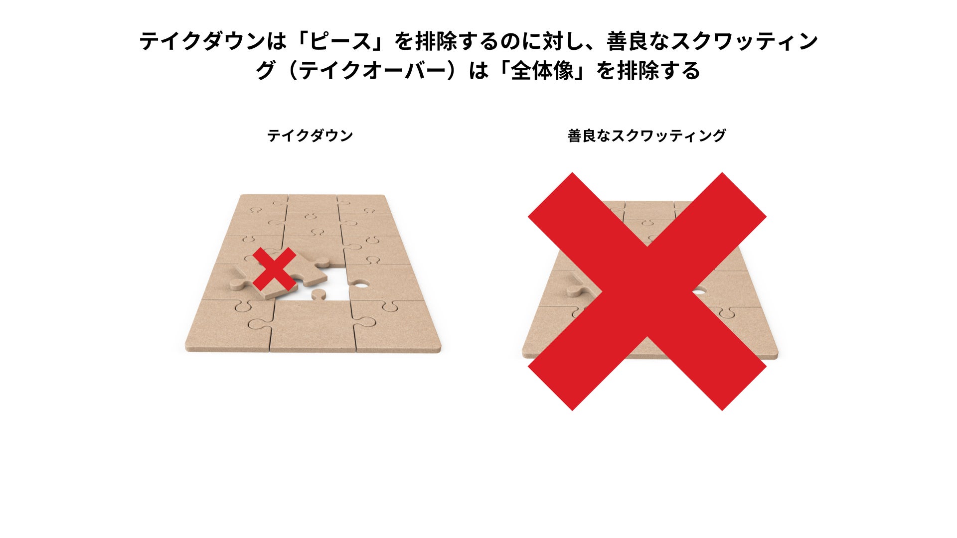 テイクダウンは看板を外すこと、看板の合法的買い取りはドメイン取得、警告表示は警告ページ掲載による注意喚起、トラッキングは待ち伏せと監視及び尾行、証拠保全が法執行機関との連携、リンクグラフが本拠地、にそれぞれ相当します(わかりやすくするための非常に大まかな例えであり、完全な対応ではありません)。