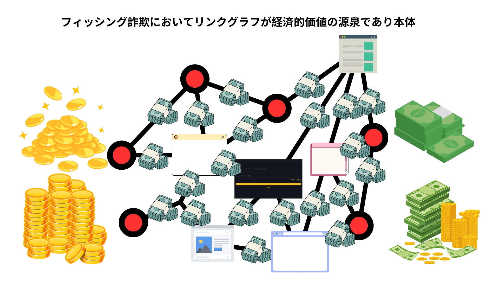 フィッシングサイト(ノード)よりもむしろリンクグラフの方にフィッシング業者にとっての価値の源泉がある、と言えます。