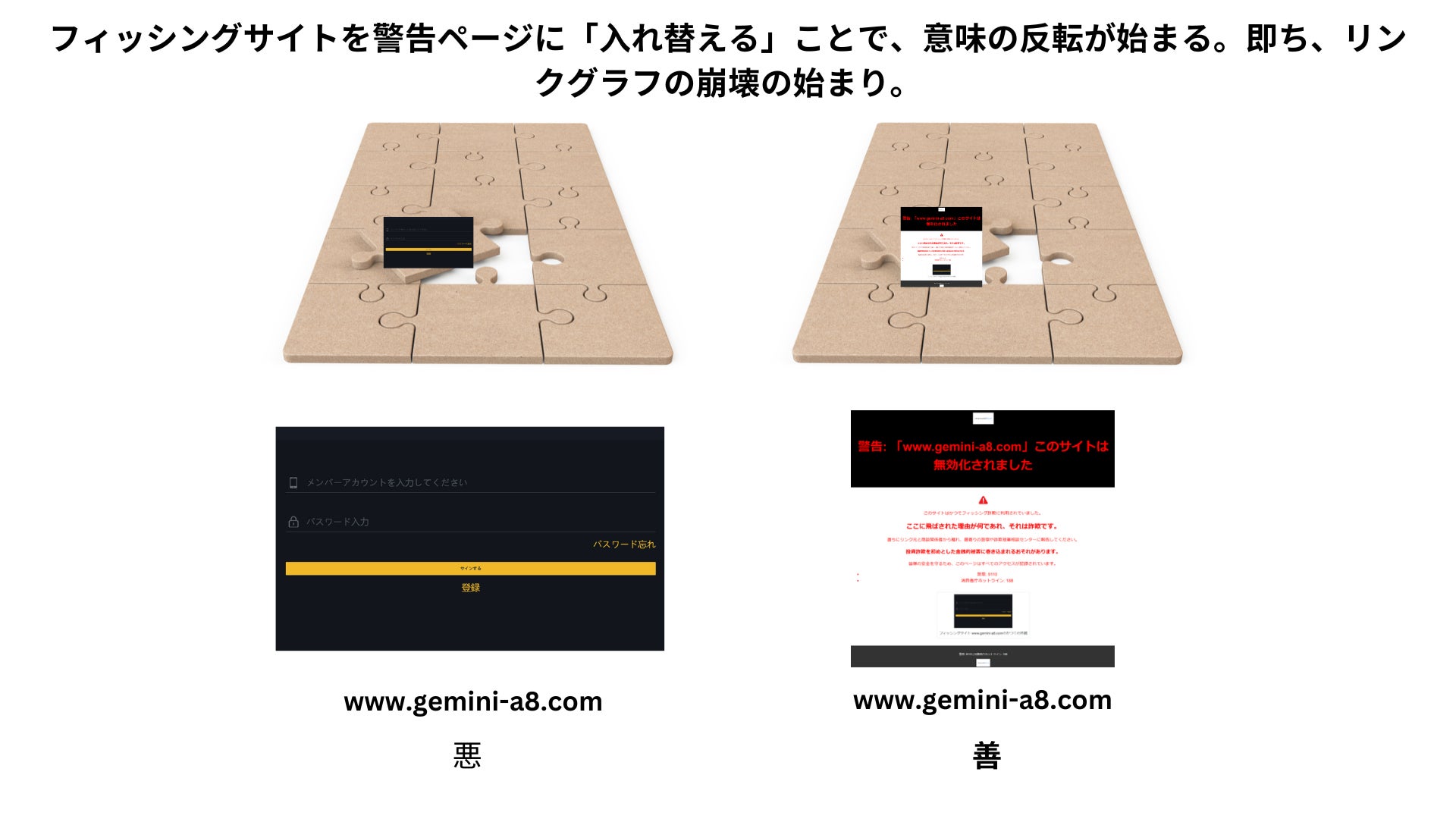これは視点を逆転させてみると、「フィッシングドメインを制するものがリンクグラフ全体を制する」、と言い換えられることがわかります。これが、リンクグラフの反転制圧のために、フィッシングドメインを取得する必要がある理由です。その上で中心ノード(フィッシングドメイン)で、フィッシング業者の詐取の意図と「矛盾すること」を行うことが、矢印を反転させ、再帰的にリンクグラフ全体を無効化することにつながる仕組みです。即ち警告ページ掲載とトラッキングです。