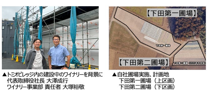 また、2026年以降、地元千葉の⾵⼟をたっぷりと吸い込んだブドウを原料とした「千葉市ワイン」の醸造を⽬指すため、2024年春 千葉市内に⾃社圃場 40アールを開墾。場所は若葉区下⽥町。初年度は世界中で評価されている欧州系品種を7種選定し、約300本のワイン⽤ブドウを定植し、栽培を開始しました。2025年には第⼆圃場 30アールの拡張を予定しております。
