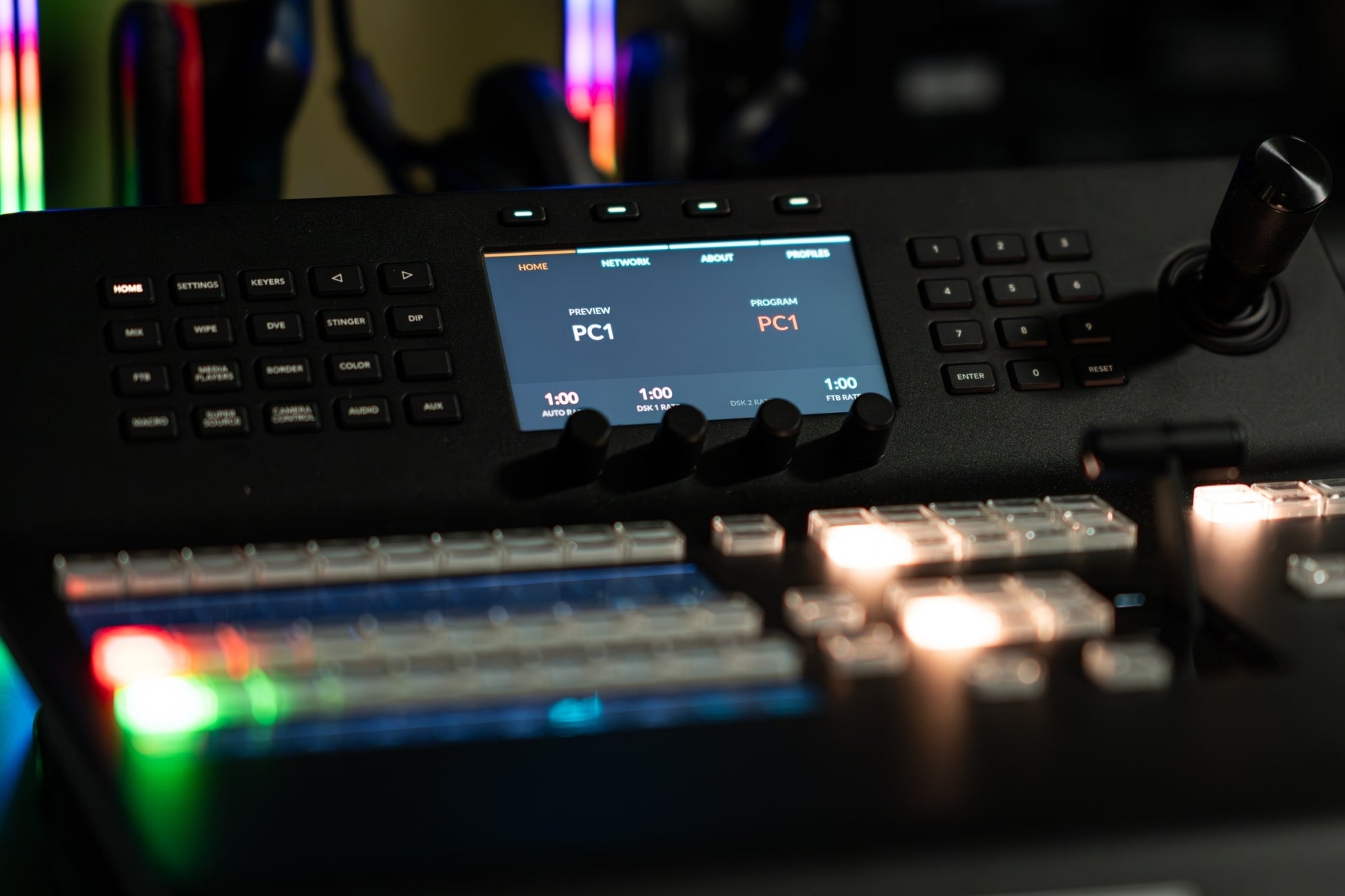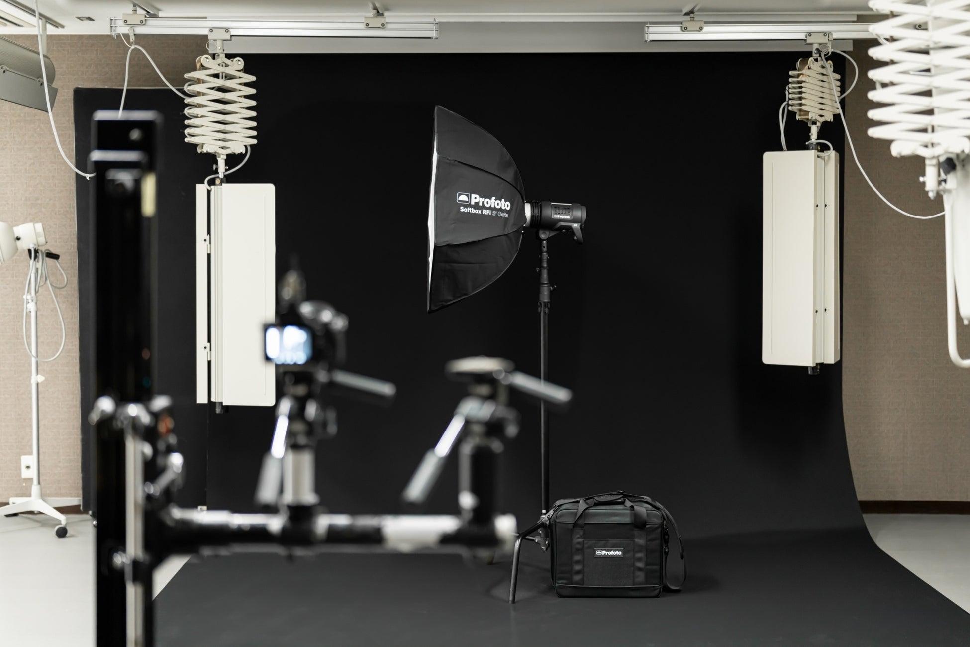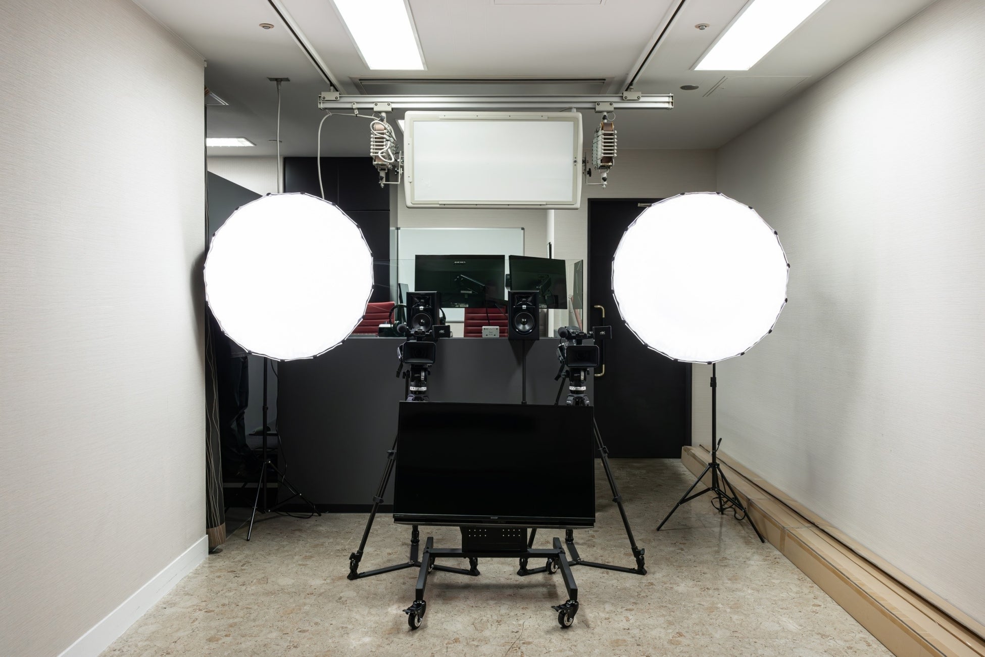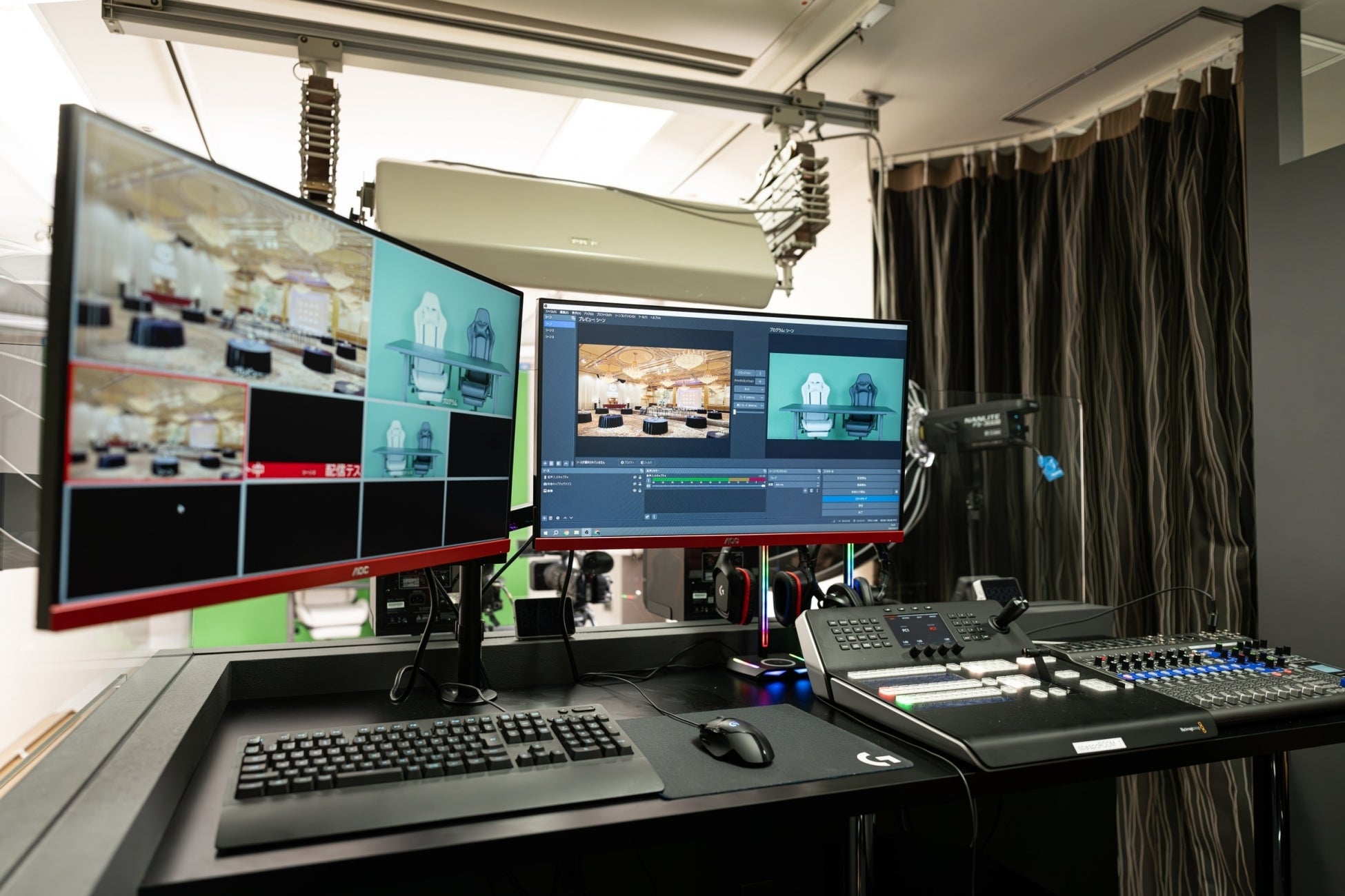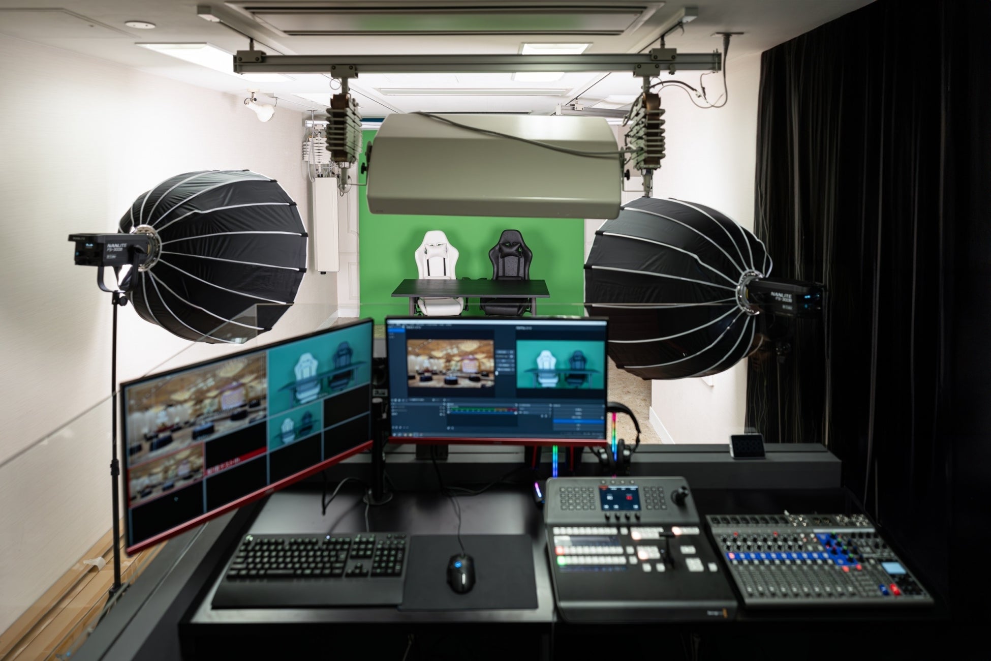 「studio Droit」の配信スタジオは全国的にも珍しい、 ホテル内に完備された配信スタジオです。 グリーンバックを完備し、スイッチャーや音声ミキサー など、プロフェッショナルな配信設備が常設されており、 多彩なコンテンツ制作をサポートします。