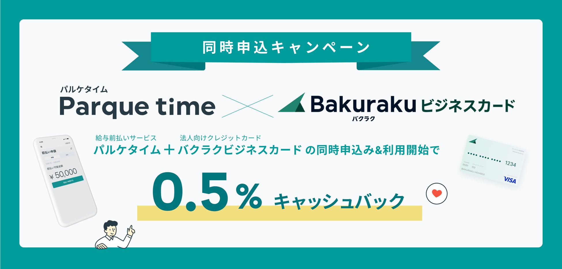 パルケタイムとバクラクビジネスカードを同時申し込み、利用開始したお客様を対象に利用開始月より2年間、前払いした給与額の0.5%を還元いたします。