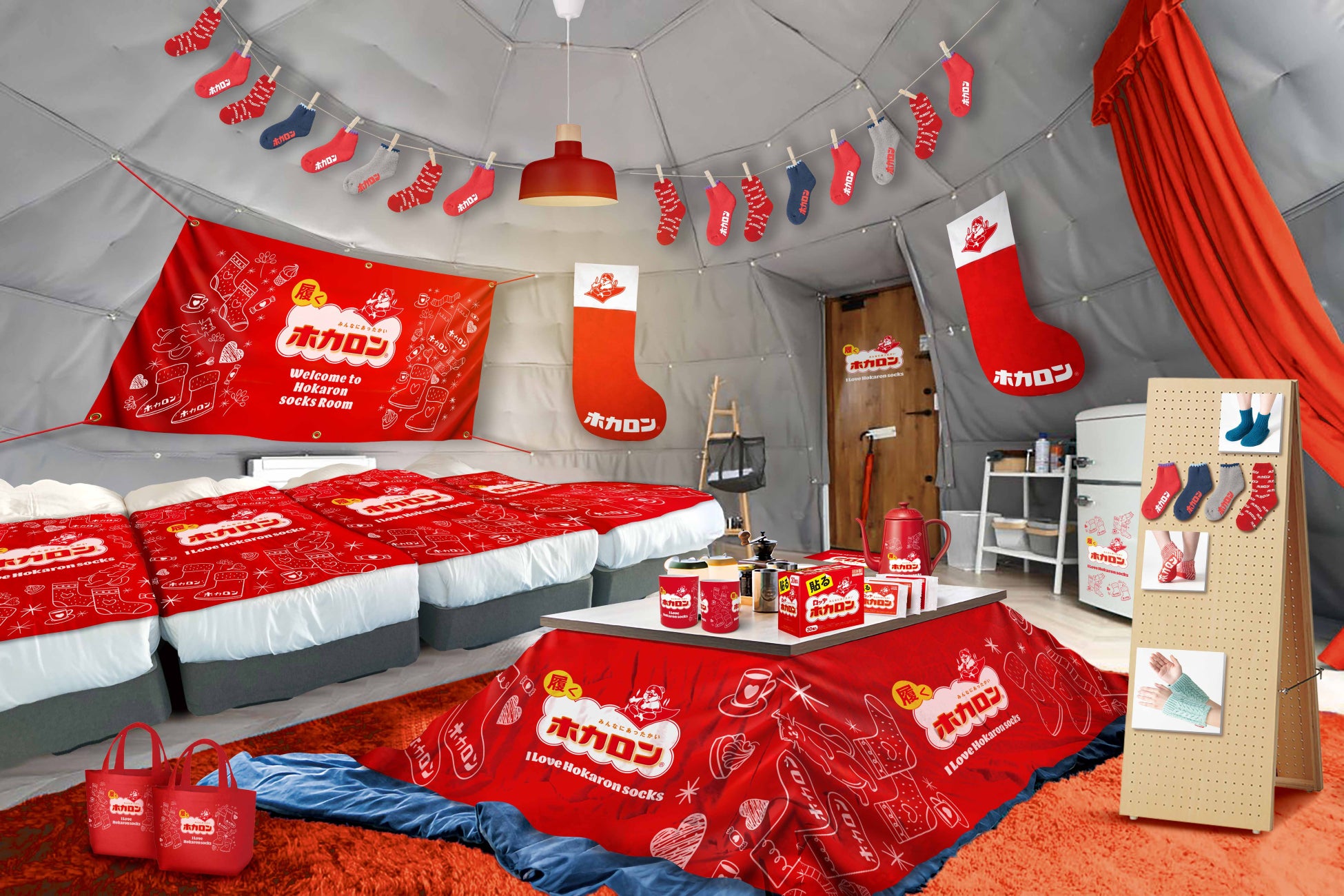 誕生当時から変わらない「ホカロン」のカラーリングである赤色をカーテンやカーペットに配し、ホカロンのデザインをドームテントの各所に散りばめました。また、宿泊される女性の方には、ホカロンソックスをお一人にひとつずつご提供します。さらに、コラボ期間中は、ご宿泊者へホカロンカイロの他、ホカロン販売元であるロッテのチョコレート、ビスケットをご用意。暖かいドームテントのなかで、お召し上がりいただけます。
