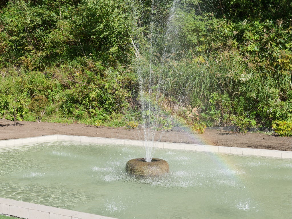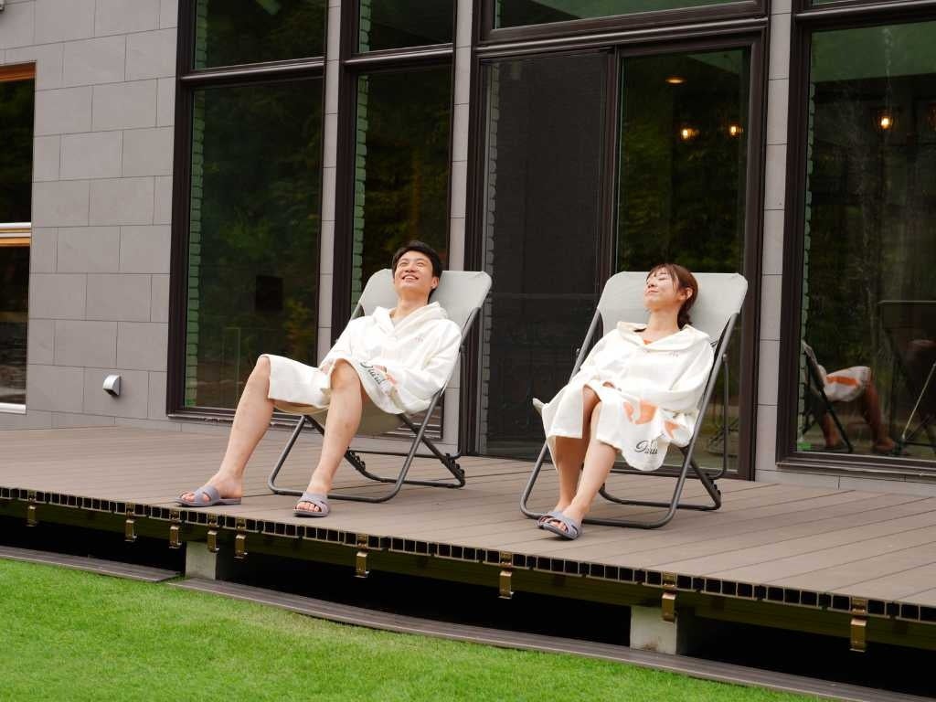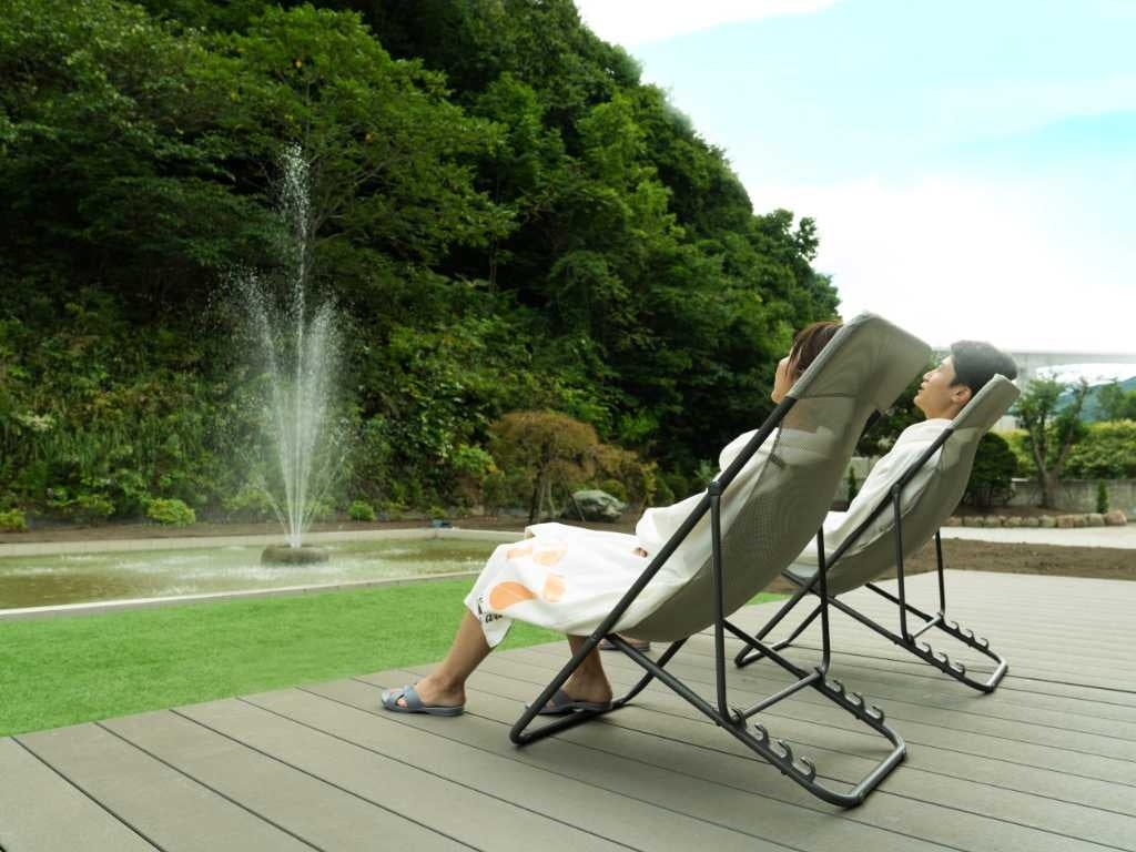 外気浴スペースにでると目の前に広がる山の緑。噴水、生い茂る山の木々を眺めながら、夜は星を眺めながら、ゆったりとした時間をお過ごしいただけます。