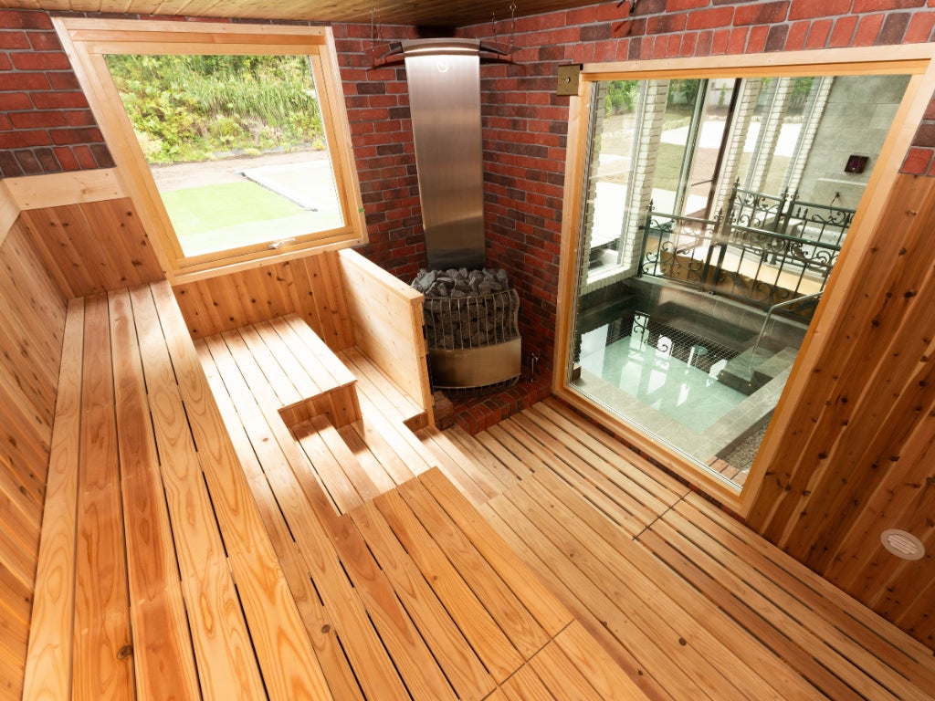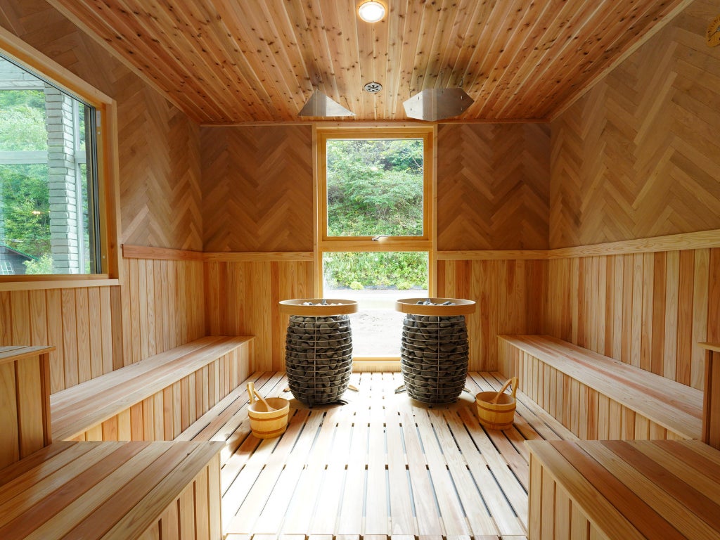 【サウナストーブ】HARVIA「SPIRIT9」(北海道初導入)を2台、HARVIA「CILINDRO6」1台。75℃設定。どこに座ってもセルフロウリュできる。