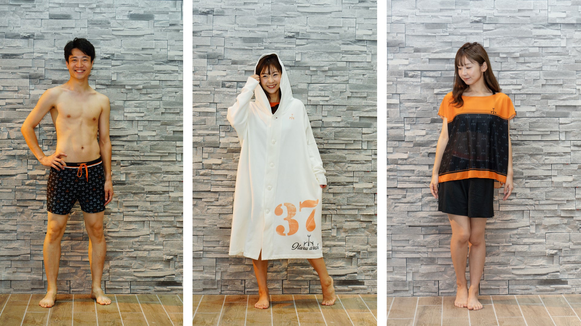 水着、サウナハット、サウナローブ(ポンチョ)は利便性・デザイン性・使い心地などをこだわって作ったデザインや生地選びからすべてオリジナル(レンタル・販売あり)で製作しました。水風呂に入ったときの心地よさを考えるなどサウナ―目線で商品を開発。ポンチョとバスローブの良いところ取りをしたサウナローブは纏うだけで包まれる安心感を与えてくれる国産ラッチパイル素材を使用。他の人と混同しないよう、右下に1番~37番までのナンバリングがされています。女性水着は体系をカバーしながらオシャレで恥ずかしくない水着を目指し、試作を繰り返して製作しました。