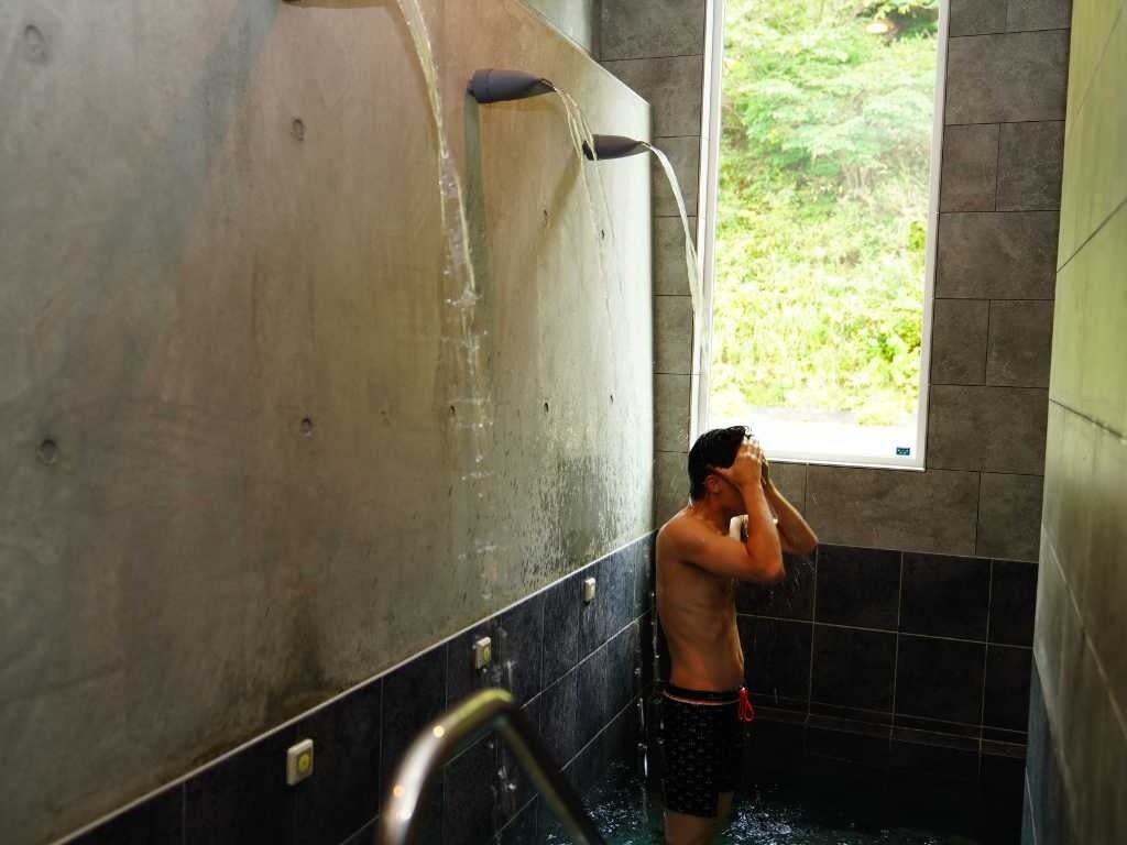 小樽唯一のダム「朝里ダム」をモチーフとした水風呂です。水温は約15℃。深さはなんと1111㎜。世界一(数字が)ととのっている水風呂です。壁のボタンを押すとダムの放水のように、上から水が落ちてきます。