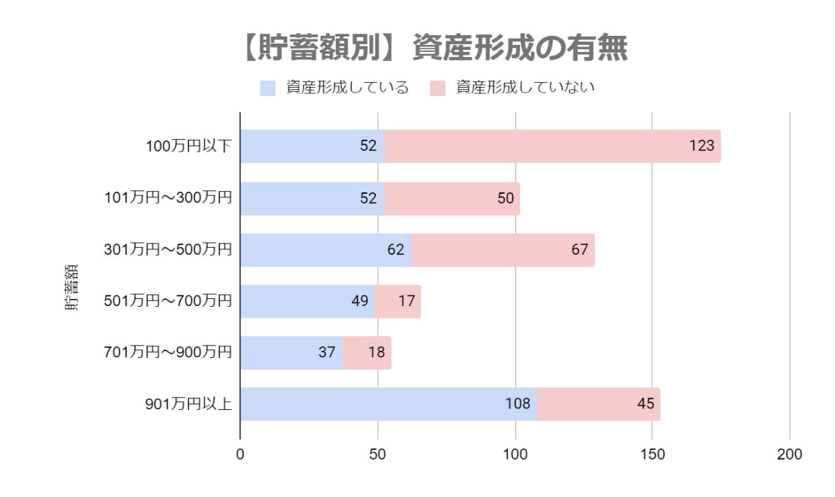 貯蓄100万円以下だと175人中52人(29.7%)しか資産形成をしていませんが、貯蓄901万円以上だと153人中108人(70.6%)が資産形成をしているという結果です。