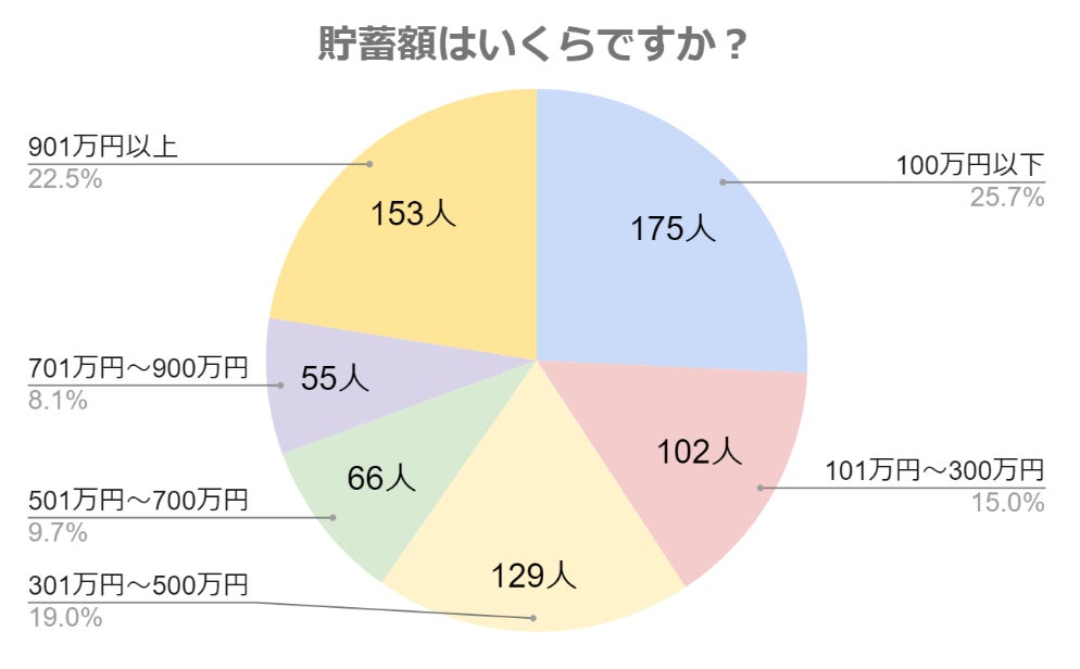 貯蓄額については「100万円以下」が25.7%、「101~300万円」が15%、「301~500万円」が19%、「501~700万円」が9.7%、「701~900万円」が8.1%、「901万円以上」が22.5%という結果でした。