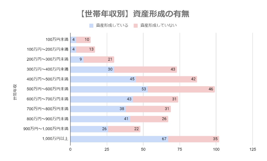 世帯年収が300万円を超えたところから資産形成をしている方の割合が大幅に増え、世帯年収400万円を超えたところから資産形成をしている方の割合が50%を超える結果です。