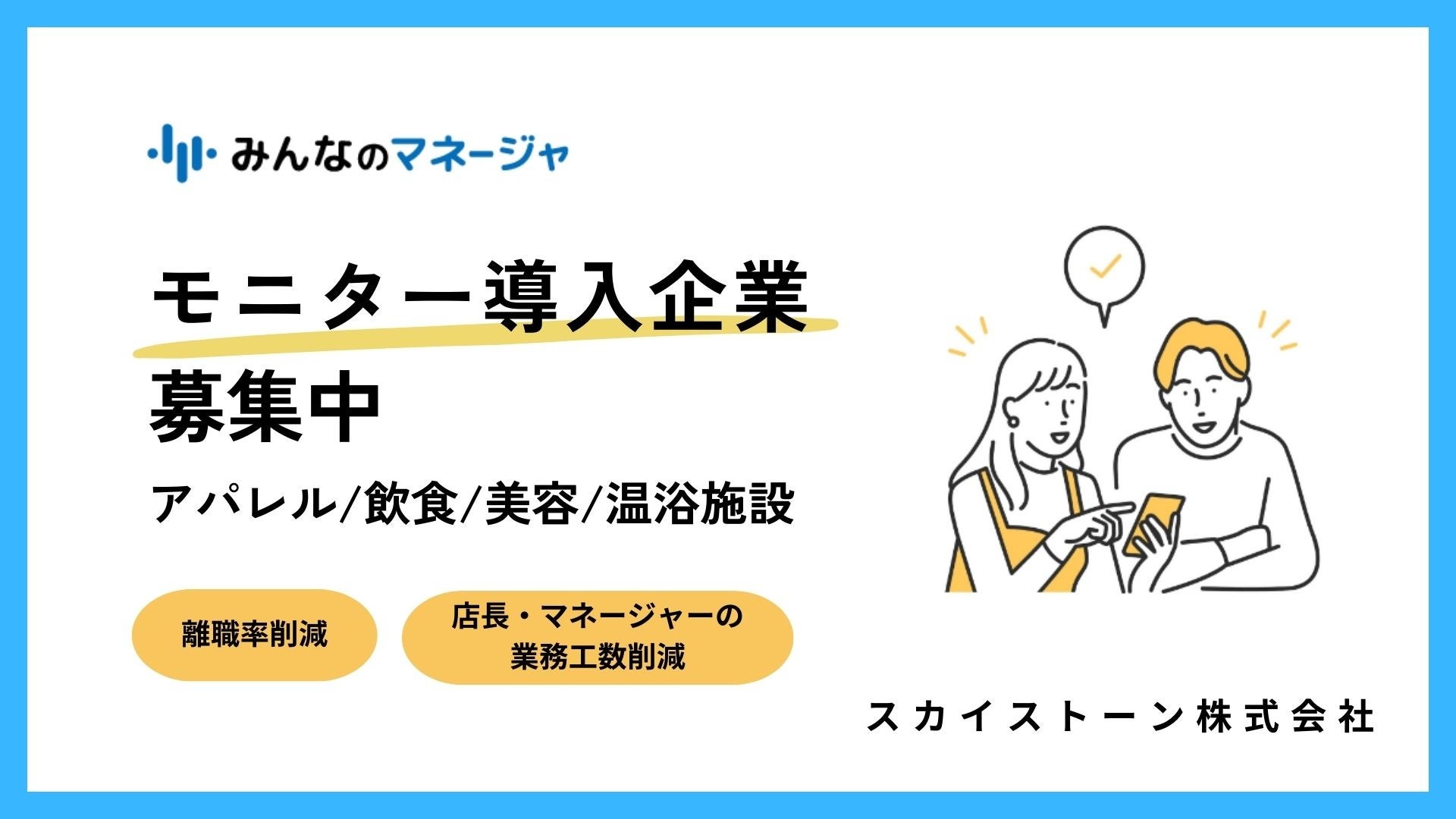 人事クラウドサービスを提供するスカイストーン株式会社(本社:大阪府大阪市、代表取締役:大原泰裕)は、自社のデスクレス現場向け人材マネジメントクラウド「みんなのマネージャ」の業種特化型β版をリリース予定です。それに伴い、モニター導入企業を募集いたします。