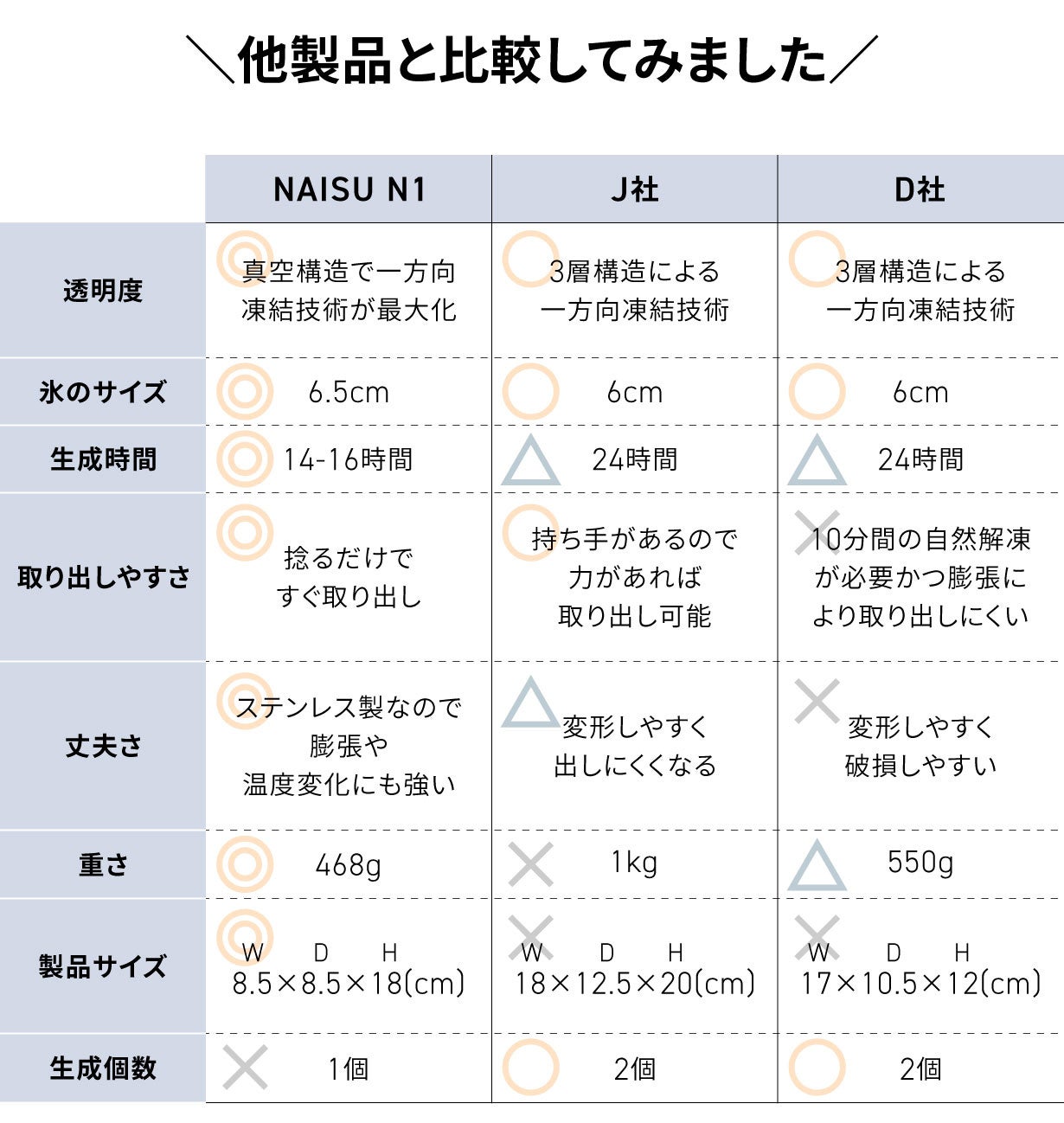 「はじめて球体の氷を作りましたが、この「NAISU N1」はとてもおすすめできる商品だと感じました。 丸い氷を作るとなると今までのイメージとしては、装置が大きくかさばるものであったり、出来上がった氷の中心が白く濁っていたり、球体の形がイマイチだったりと、上手く作れない印象がありましたが、このNAISU N1は、水道水をタンブラーに入れて冷凍庫にいれるだけでまん丸の透明感抜群の氷が作れてしまったのでおすすめしない理由がないと感じるほどです。」