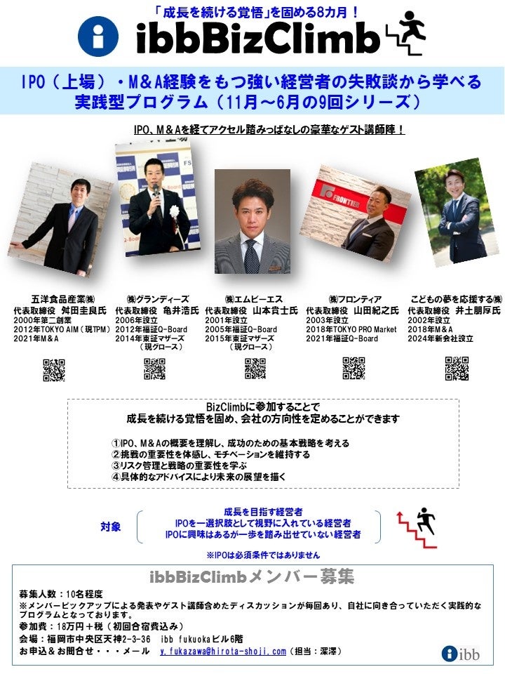 株式会社アイ・ビー・ビー(本社:福岡県福岡市、代表:廣田稔)は、IPOを一選択肢として視野に入れている経営者向けのプログラム「ibbBizClimb(ビズクライム)」を、2024年11月よりスタートいたします。
