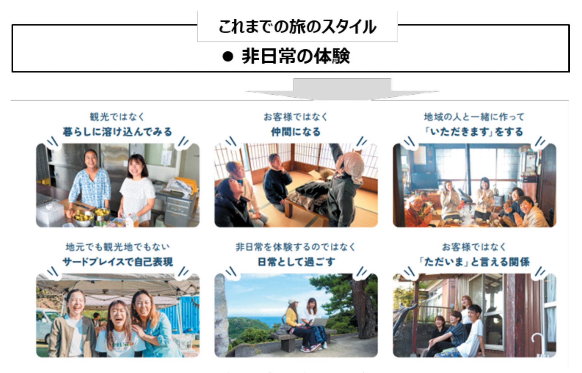 日本各地の魅力的な地域を訪れることで得らえる“新しいライフスタイル”の可能性をこちらで探していただき、旅行と移住の間に位置するこの新しいスタイルが、行くたびに、人もまちも成長していく、そのような生活体験をお手伝いできることを目指しています。