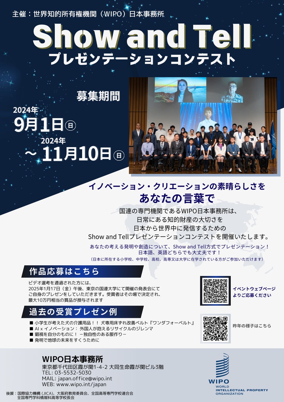 イベントウェブサイト(応募はこちらから):https://www.wipo.int/ja/web/office-japan/w/news/2024/the-2nd-show-and-tell-presentation-competition