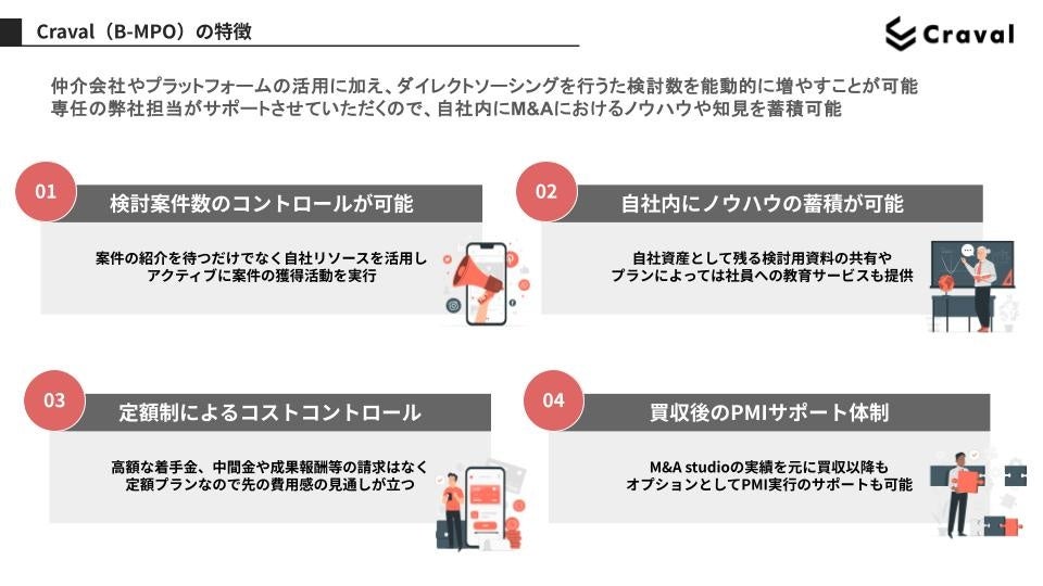 M&A支援を手がける株式会社Craval(代表取締役:加藤耀介、本社:東京都新宿区、以下Craval)は、M&Aの買い手向け支援サービス「B-MPO」の提供を開始いたしました。