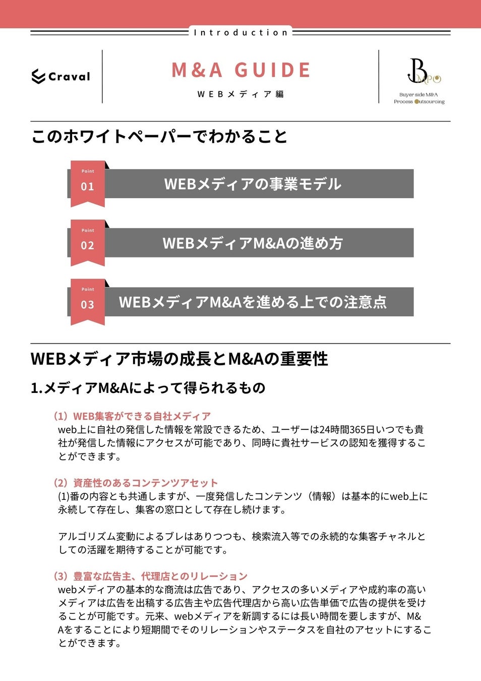本資料では、WEBメディアの基本情報からWEBメディアに特化した買い手側のM&A進行方法、実際に買い手担当として複数件のM&Aを実行したコンサルタントのノウハウを公開しています。