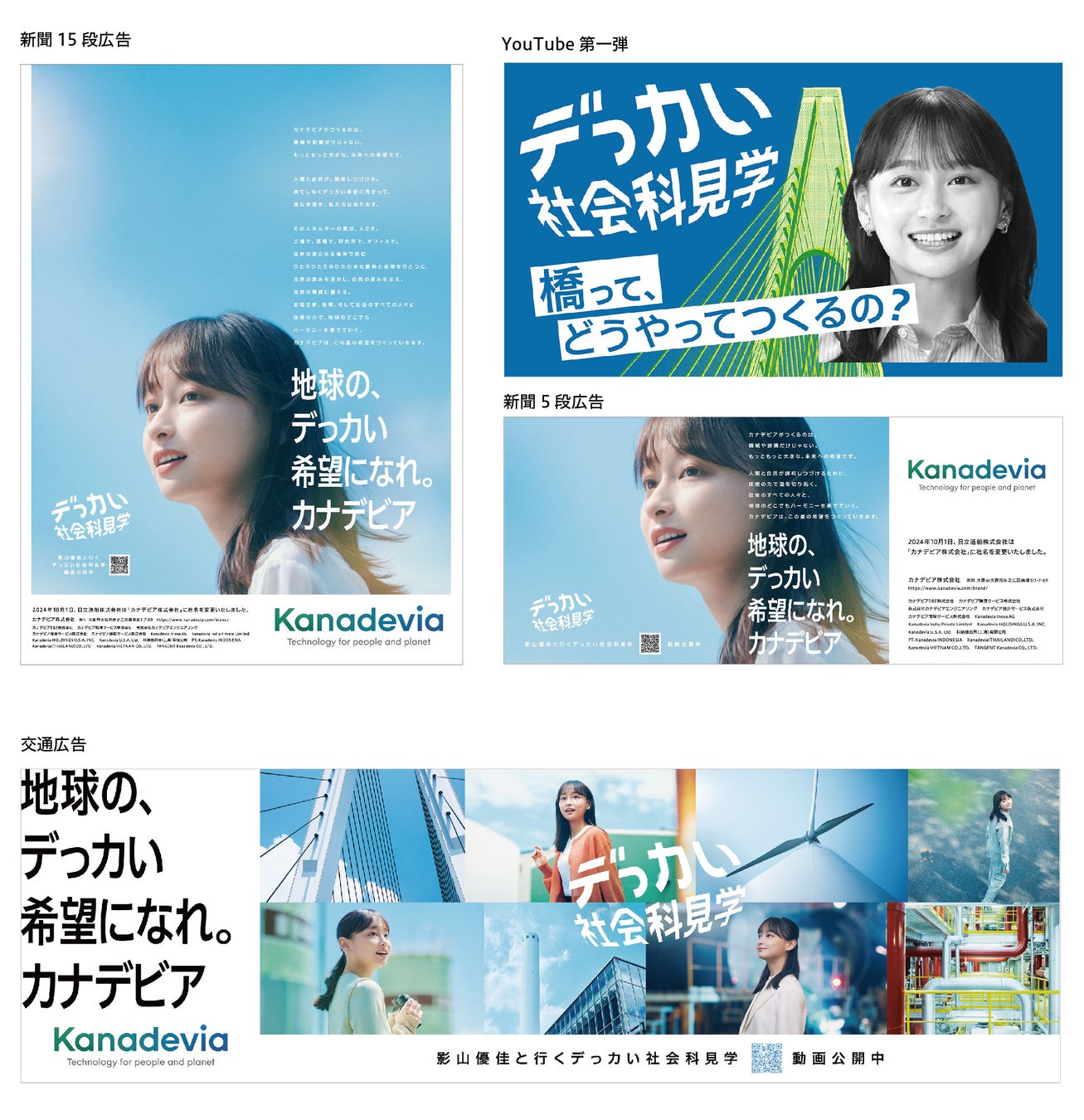 CM連動企画として「デっカい社会科見学」と題したYouTubeコンテンツや交通広告も展開いたします。カナデビアが取り組む「デっカい」社会課題解決の現場を影山さんがナビゲートします。YouTubeコンテンツでは、第一弾「デっカい橋づくり」篇をブランドサイトおよびYouTubeチャンネルにて10月1日より公開。当社のインフラ事業より橋梁を取り上げます。撮影は、当社の施工橋梁である、尾道大橋・新尾道大橋が架かる向島工場で行いました。