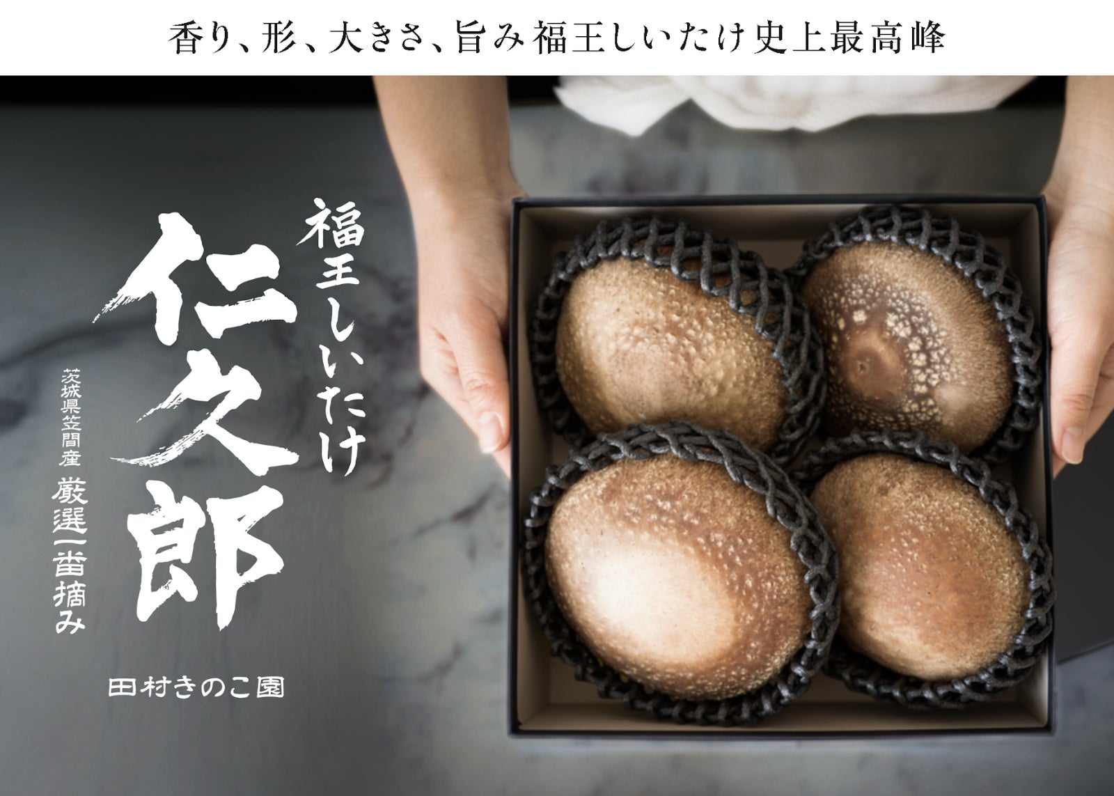 師匠の名前である「仁久郎」はもともと一番小さな椎茸につけられていました。この名を今度は一番大きく美しい最高の椎茸につけさせていただきました。これには、福王しいたけの生みの親であり、昨年亡くなられた師匠の名が、田村きのこ園の最高峰の椎茸とともに未来に残ってほしいという想いが込められています。私の人生を変えた椎茸をぜひ多くの方に召し上がっていただきたいです。