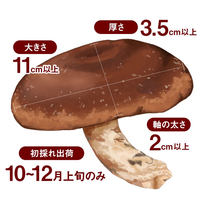大きさ11cm以上、厚さ3.5cm以上、軸の太さ2cm以上の基準をクリアした、形の美しいものだけが「仁久郎」として選ばれます。椎茸とは思えない存在感は、まるでA5ランクのステーキを彷彿とさせます。