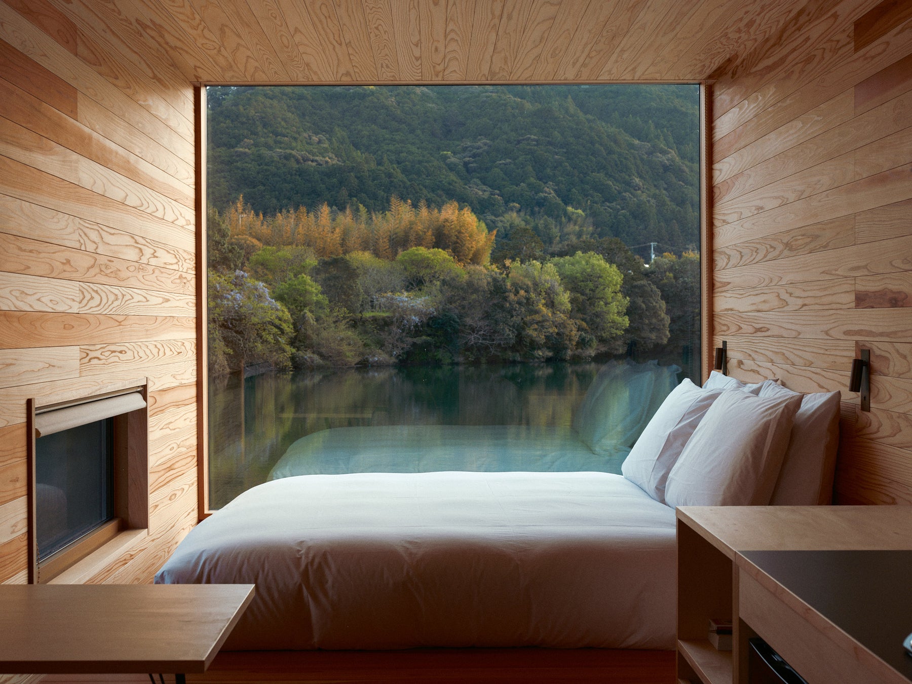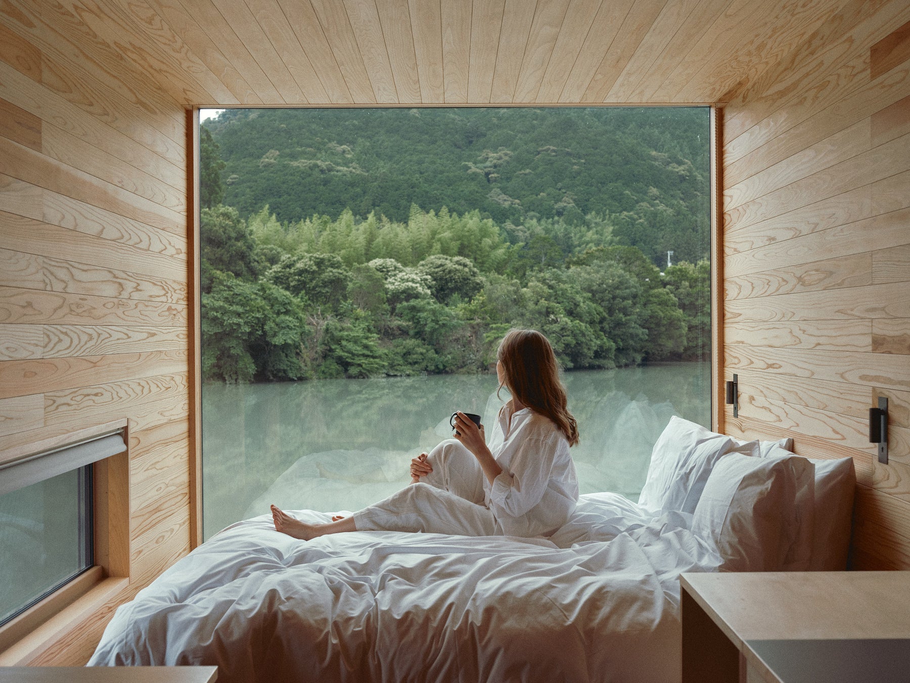 客室からは悠々と流れる川を一望でき、日々刻々と変化する自然を近くで体感できます。室内には、クイーンサイズのベッド、キッチン、トイレ、シャワールームを備え、外にはオープンデッキや庭もあります。日常から離れ、自分だけの時間をお愉しみいただけます。