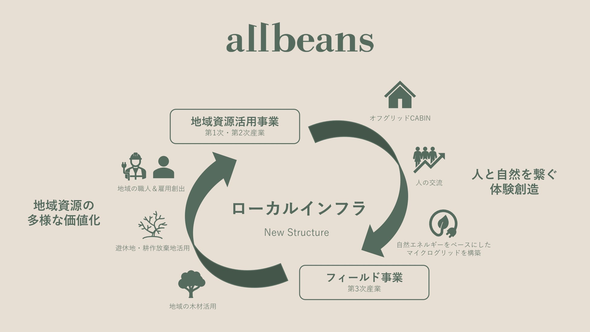allbeansはキャビンを通して地域に必要な「ローカルインフラ」の確立を目指しています。ローカルインフラとは、地域内で自然資本と経済資本が循環する仕組みのことです。地元の木材を使ってキャビンをつくり、荒廃した土地に価値を与える、自然資本の循環。ホテル運営で雇用を生み出す、経済資本の循環。人口減少の影響を大きく受ける地方を拠点に、こうした仕組みをつくり、持続可能なローカルの創造に向けて取り組んでいます。